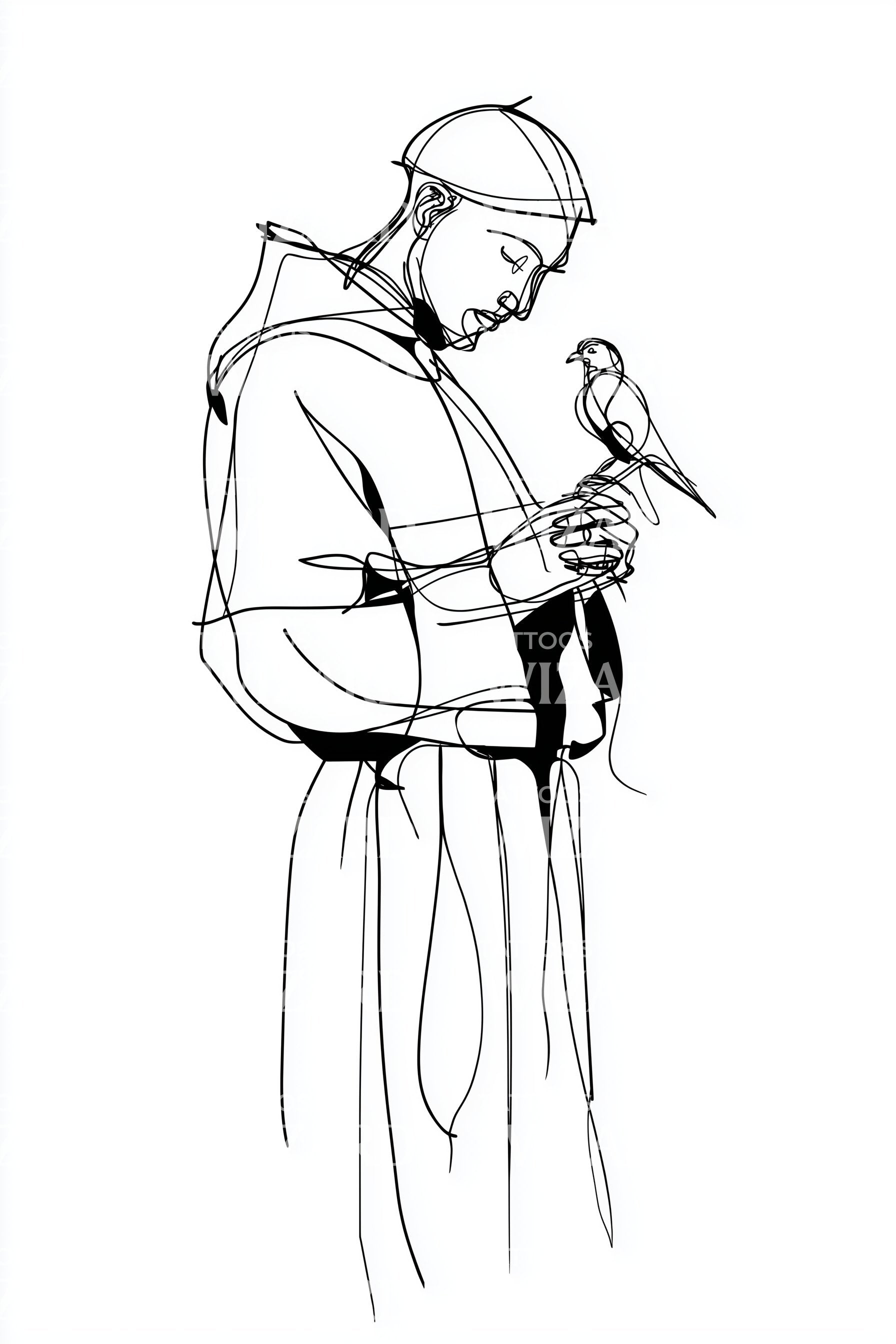Примите духовность и смирение с нашим дизайном татуировки Святого Франциска. Эта уникальная работа в стиле эскиза передает глубокие элементы веры, символизируя смирение и преданность Святого Франциска. Позвольте себе насладиться этим художественным воплощением вашей веры, выраженным в изящных набросках для визуально захватывающей татуировки.