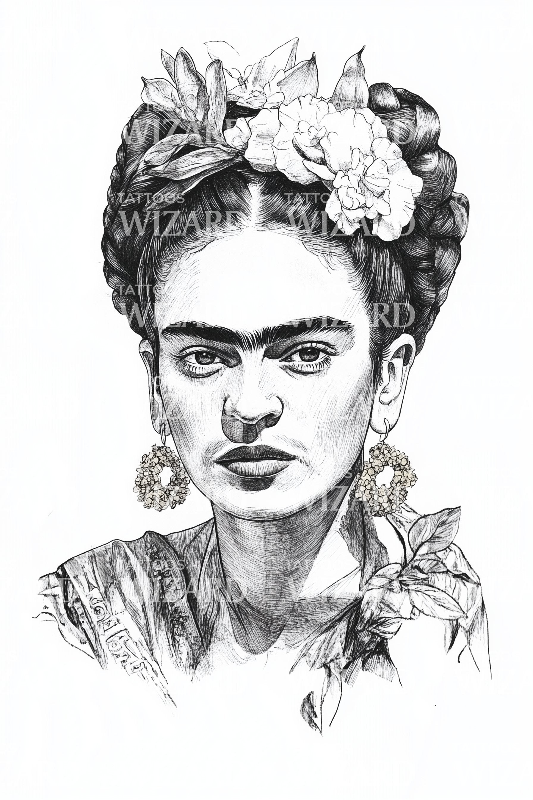 Этот тату-дизайн в стиле Фриды, выполненный в черно-серых тонах, демонстрирует классическое мастерство. Изображая портрет культовой мексиканской художницы, он наполнен культурой и оригинальностью. Излучая интенсивное, завораживающее очарование, дизайн отражает живость самой Фриды. Украсьте свою кожу этим уникальным, вечным шедевром в черном цвете.