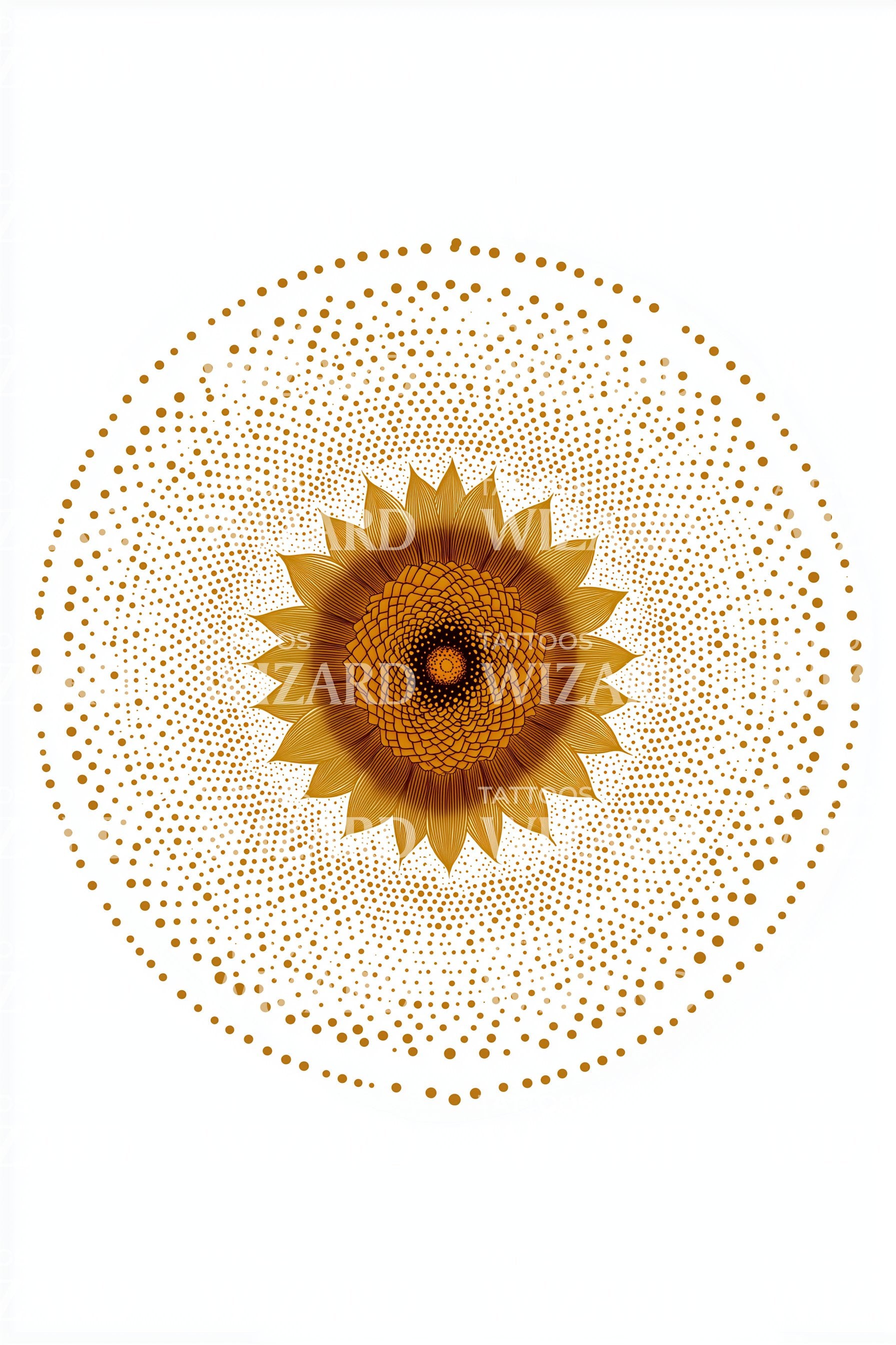 Ощутите силу солнца с нашим позолоченным дизайном тату мандалы. Он передаёт суть сияющего солнца через изящную точечную работу и мерцающие золотистые оттенки. Дизайн отличается минималистичными, но визуально впечатляющими лучами, предлагая уникальную интерпретацию классического искусства мандалы.