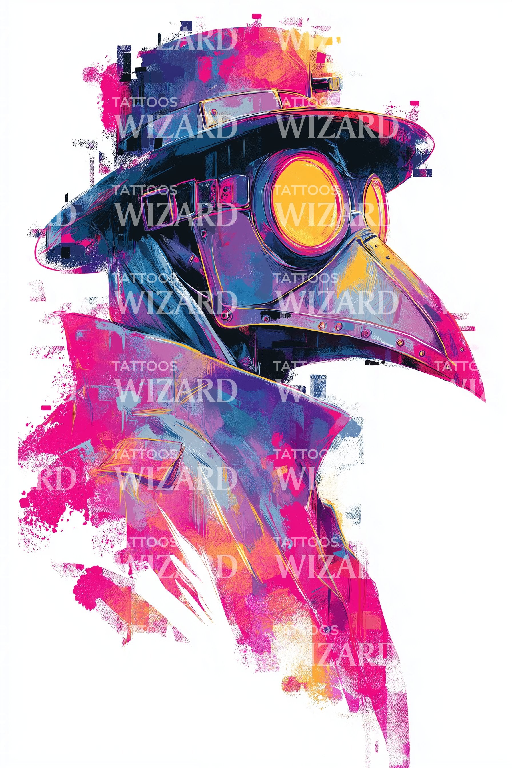 Освободите своего внутреннего бунтаря с этим динамичным тату-дизайном в стиле Newschool. Он искусно сочетает яркого неонового доктора чумы, эффекты глитча и выразительные цветные капли. Этот дизайн творчески воплощает исторического доктора чумы в современной, дерзкой интерпретации. Смелая работа для тех, кто осмеливается мечтать иначе.