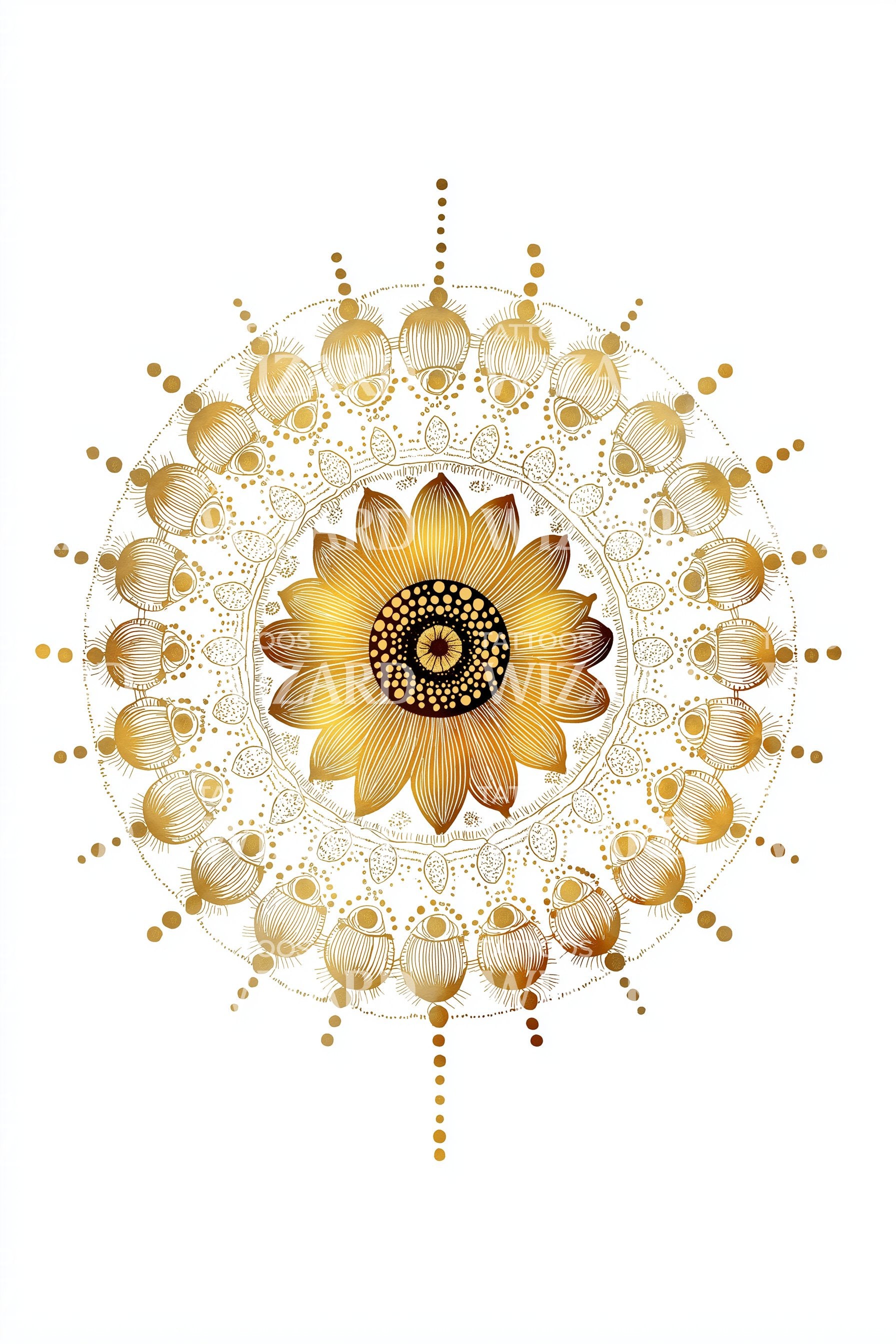 Украсьте свою кожу сияющей золотой татуировкой мандалы, которая наполняет священной атмосферой. Тщательно выполненный с изящной точечной техникой, этот дизайн воплощает великолепие солнца. Ощутите божественную красоту и духовное богатство, заключённые в этом потрясающем произведении искусства.
