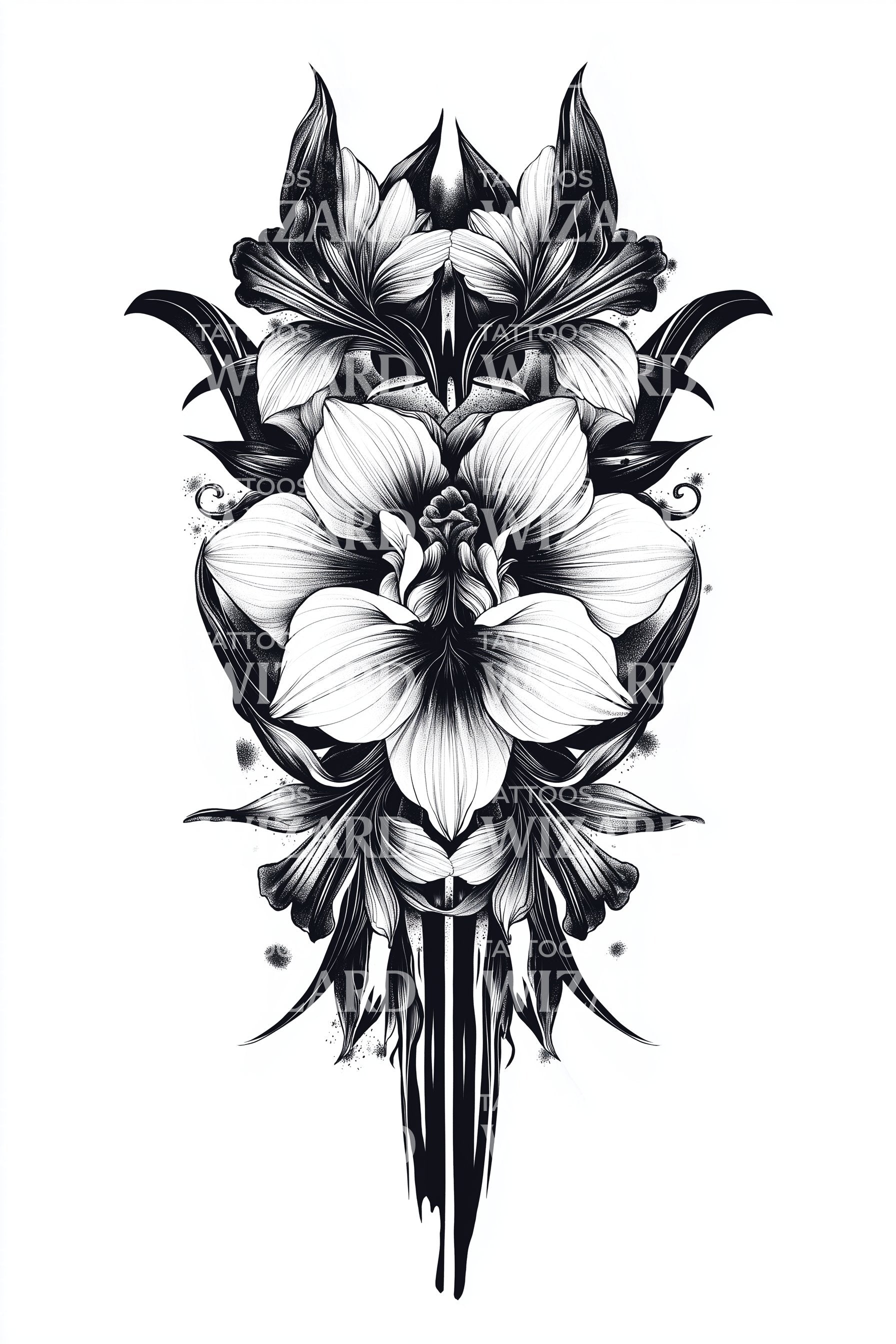 Погрузитесь в таинственное очарование этого готического тату в чёрно-серой гамме. Оно представляет собой сложное сочетание кластерных и цветочных мотивов, переплетённых в завораживающем симметричном узоре. Глубокое по деталям и эстетике, это изображение вызывает ощущение вечной красоты с мрачным, завораживающим оттенком.