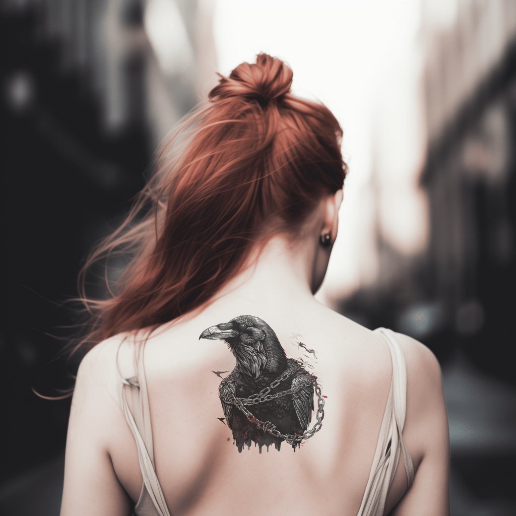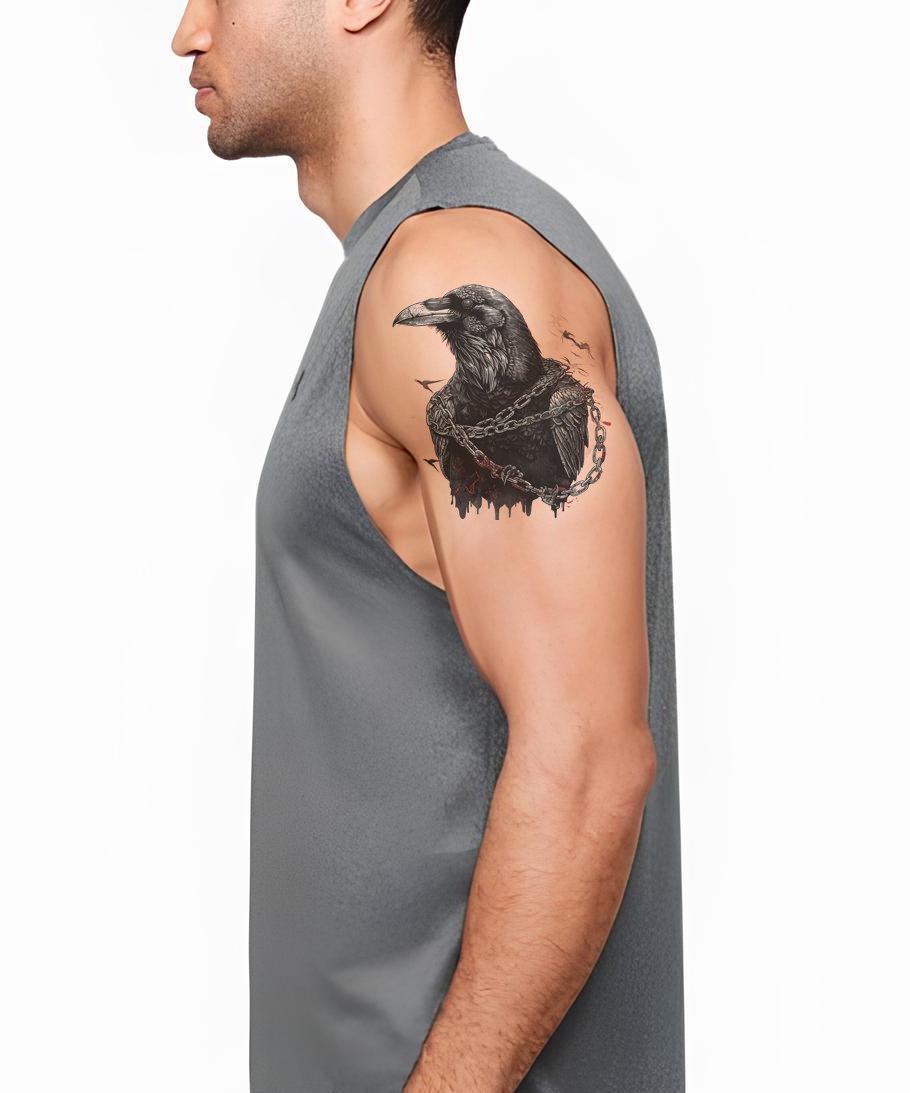Погрузитесь в завораживающую красоту тьмы с этим готическим тату-дизайном в черно-серых тонах. Изображая эффектного ворона, сидящего на темных цепях, он объединяет атмосферную мрачность черных птиц с оттенком мрака, идеально подходя для ценителей загадочной, глубокой темной эстетики.