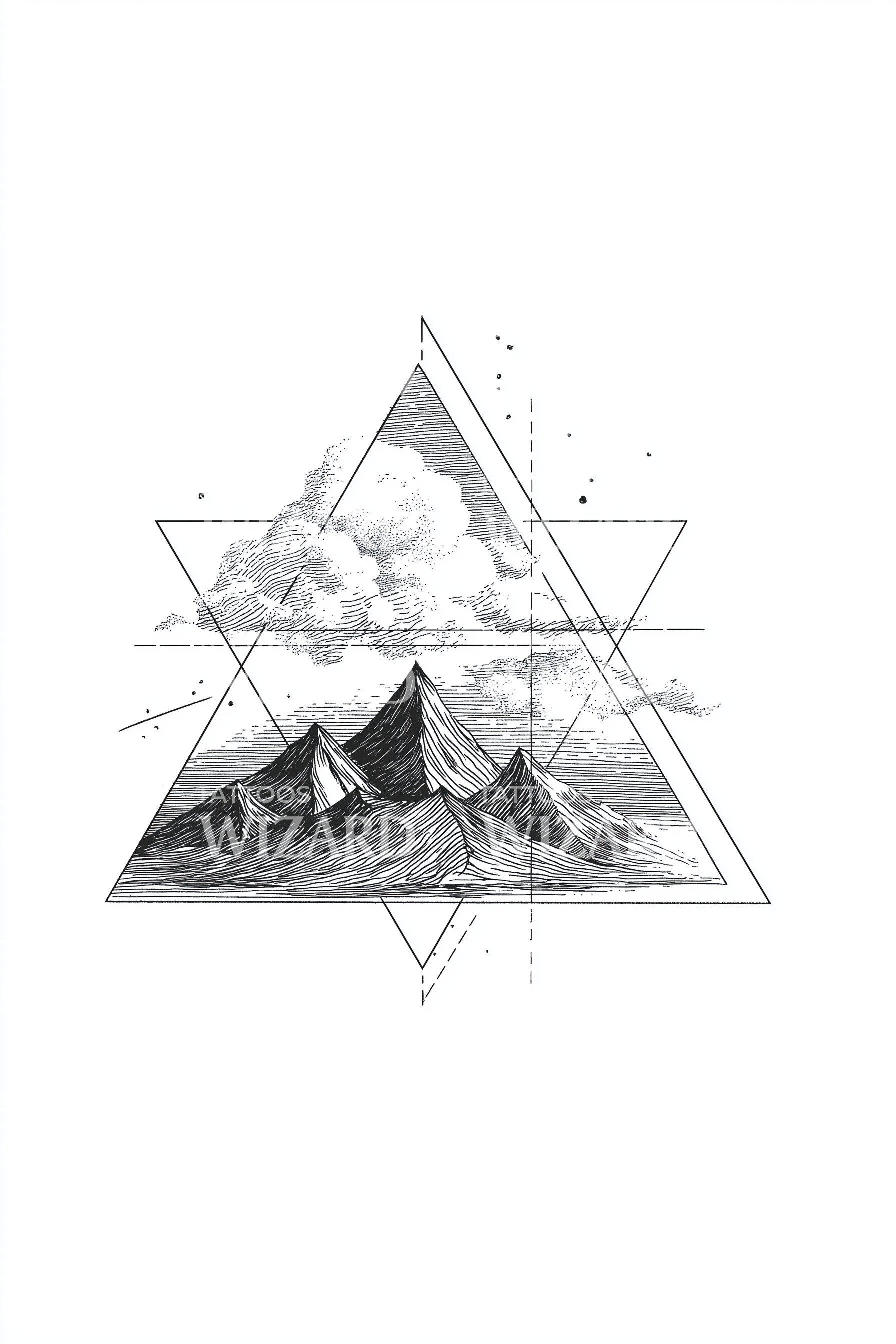 Представляем абстрактный геометрический дизайн татуировки, который искусно объединяет горные вершины с смелым узором сетки. Этот дизайн демонстрирует впечатляющий контраст между природными формами и строгими линиями. Идеально подходит для тех, кто ценит гармоничное сочетание структуры и спонтанности.