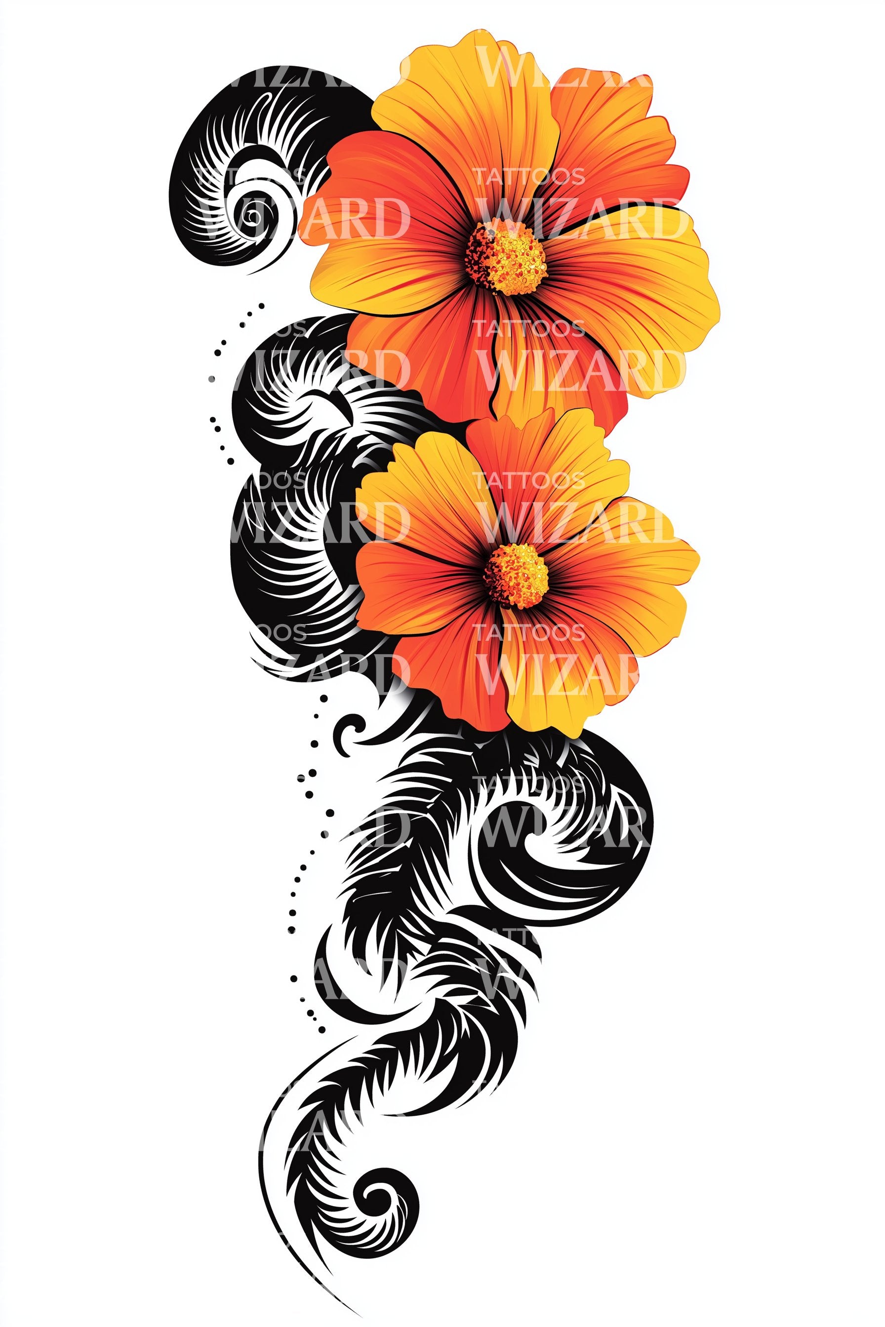 Ощутите магнетизм нашего неотрадиционного тату-дизайна, изображающего двойные цветы гибискуса, изящно заключённые в орнаментальный свиток. Характеризующийся смелыми, чёткими линиями и яркой оранжевой палитрой, этот арт объединяет современную эстетику с винтажной классикой, поистине вечный шедевр!