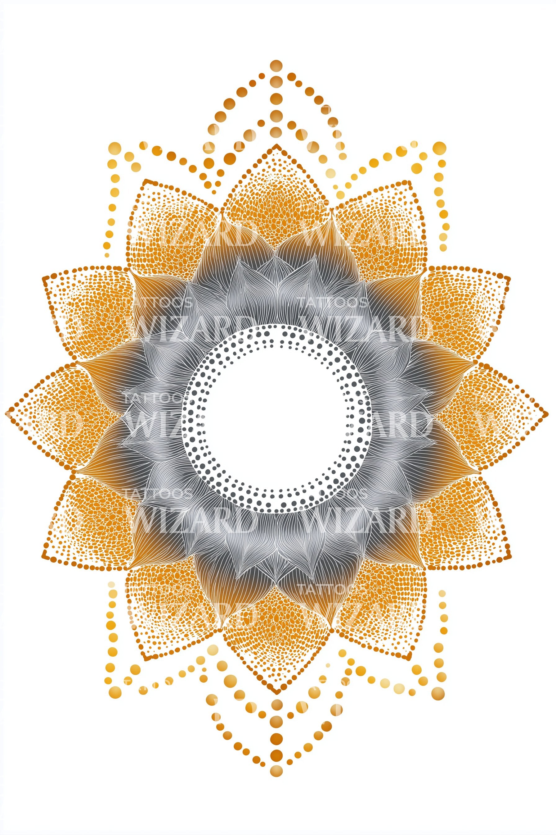 Погрузитесь в медитативную вселенную Мандал с этим изысканным дизайном татуировки. Нежные оттенки жёлтого создают гармоничное сочетание узоров сот и лотоса. Вдохновлённый священной геометрией, этот изящный элемент добавляет уникальную нотку сложных деталей на любое кожаное полотно.