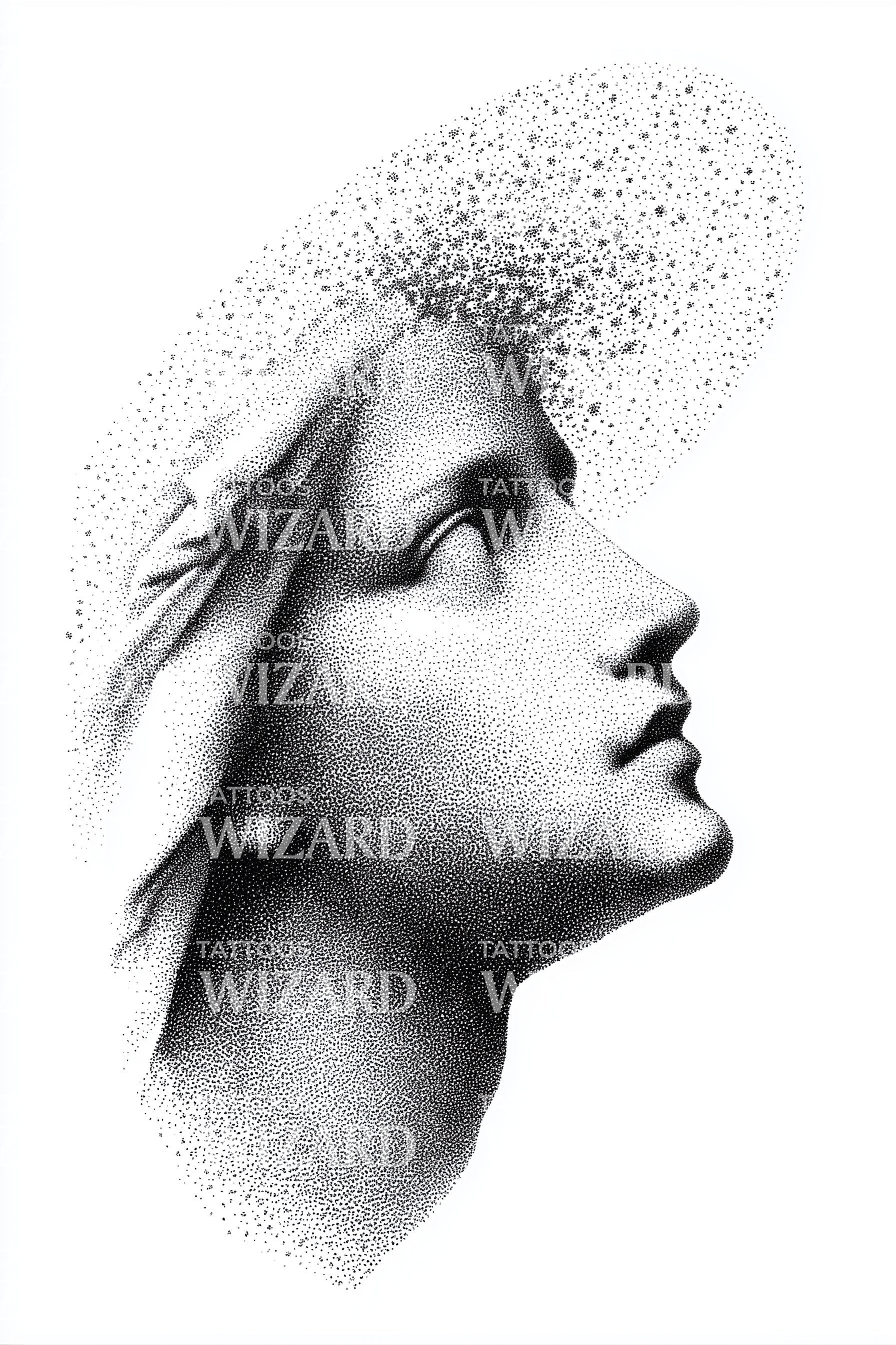 Этот изысканный тату-дизайн в технике дотворк демонстрирует спокойный портрет надежды. Тщательно выполненный методом штриховки, образ лица воплощает свет – символ непоколебимого оптимизма. Эта татуировка сочетает простоту и элегантность, добавляя вашему образу загадочное очарование.