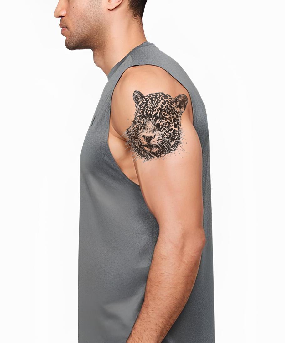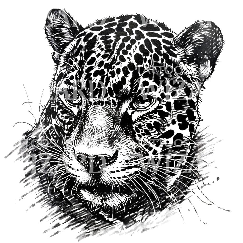 Наполните свою кожу силой дикой природы с этим дизайном татуировки ягуара. Нарисованный с прекрасной детализацией, черно-серая тушь передает интенсивную, величественную ауру ягуара. Носите силу и грацию этого завораживающего существа, запечатленную на вашей коже. Идеально подходит для тех, кто ищет смелую и божественную татуировку.