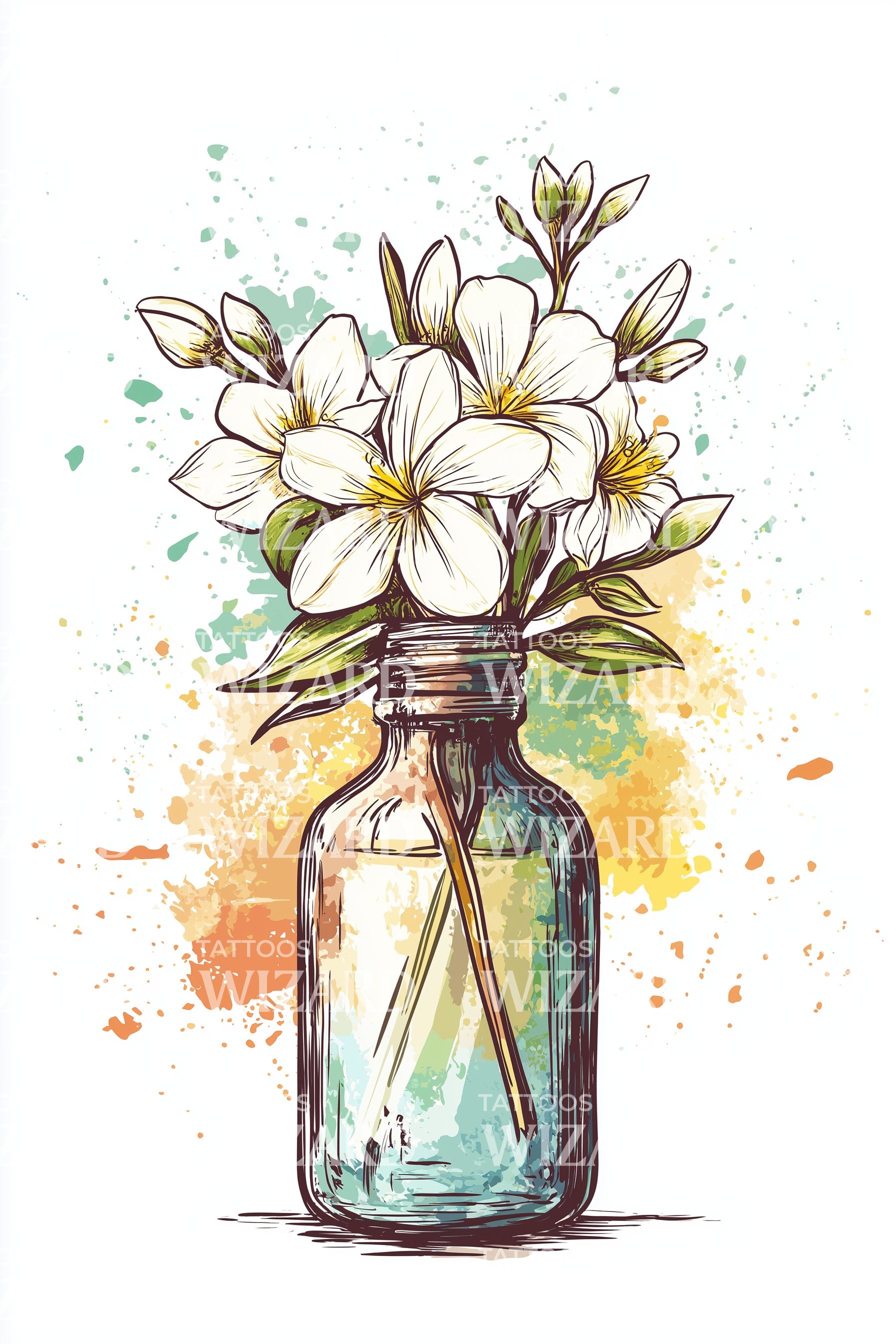 Откройте свою любовь к искусству, природе и хрупкости с этим акварельным дизайном татуировки. Он искусно сочетает яркие всплески цвета, изображая нежный цветок жасмина, заключённый в бутылочку. Это визуальное наслаждение, где текучесть и флора создают завораживающую эстетику вашего образа.