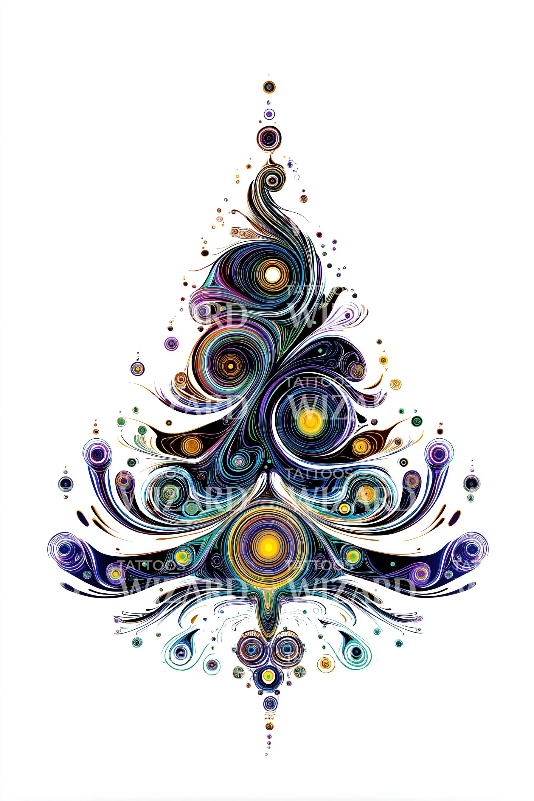 Ornamental mandala tree swirls upward in jeweled concentric rings, luminous dotwork orbs nesting like ornaments, filigree lines shaping whorled branches. Each spiral suggests winter cycles, renewal, and light returning at Christmas. Worn on skin, it kindles quiet joy and wonder, a personal altar of evergreen spirit.