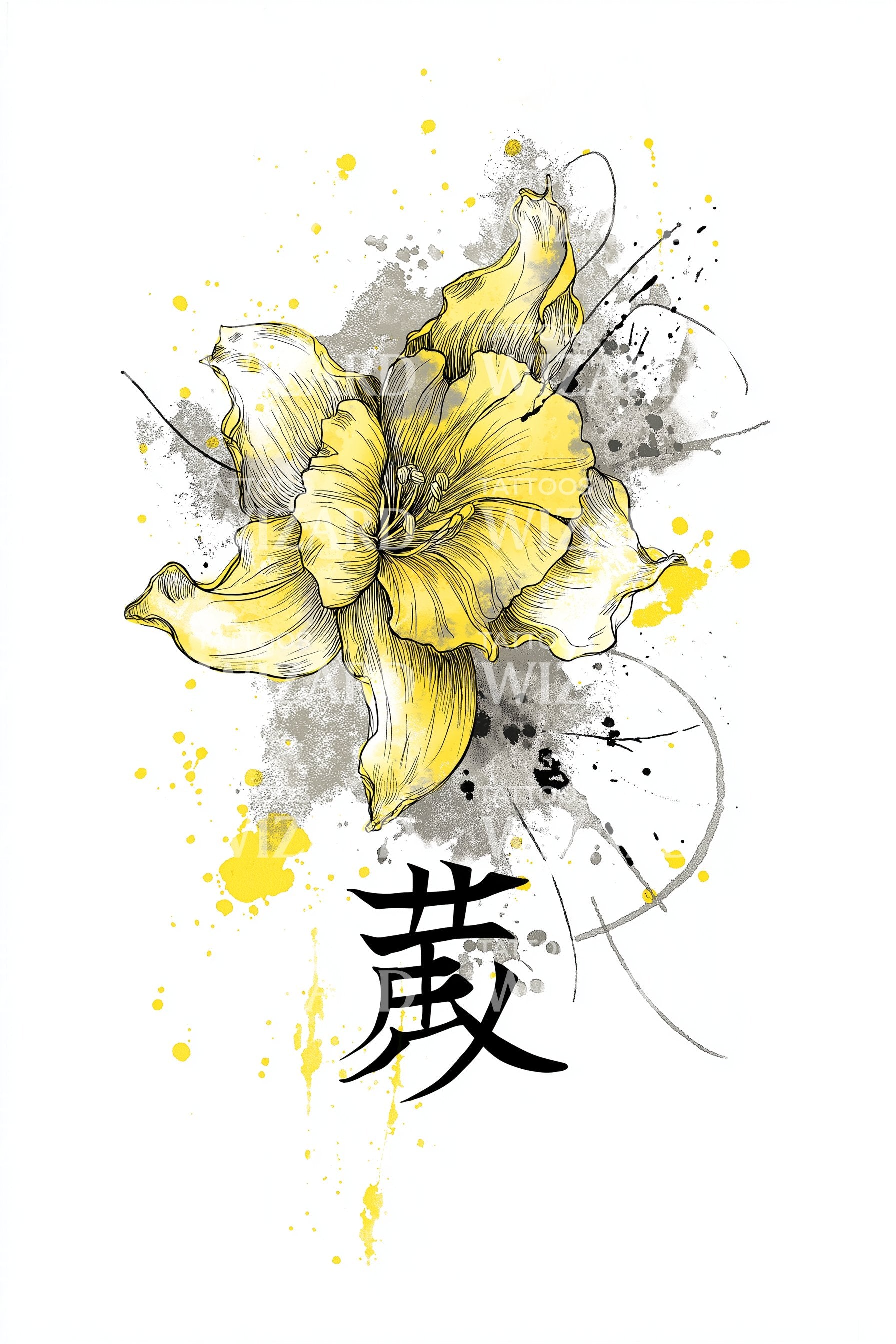 Откройте для себя изящное слияние культур в этом потрясающем дизайне тату с нарциссом. Мастерски выполненный в ярких акварельных желтых тонах, он использует выразительные символы кандзи, чтобы воплотить грацию. Техника разбрызгивания краски погружает вас в его необработанную, мимолетную красоту, создавая уникальный визуальный опыт.