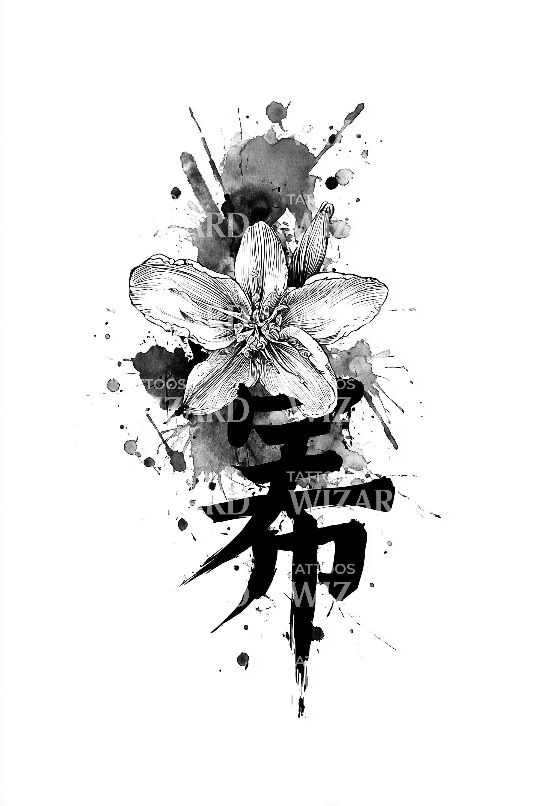 Раскройте свою внутреннюю силу с этим эскизом татуировки, изображающим нарциссы и сложный кандзи, символизирующий надежду. Искусство кистевых мазков и брызг чернил придаёт дизайну дерзкий, необработанный оттенок. Идеальное сочетание элегантности, духовности и смелости!