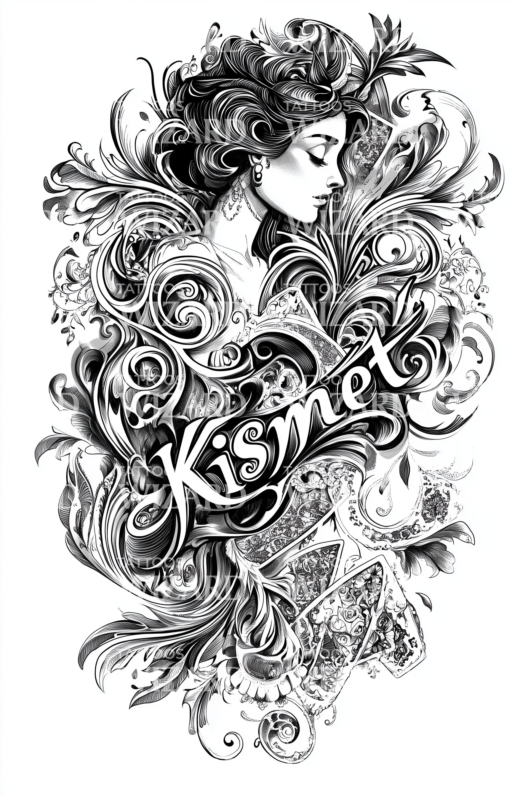 Ornate portrait, a serene profile framed by swirling filigree and vintage cards, crowned with Kismet. Symbolizes chosen fate, love of mystery, and fortune meeting courage. Feels like your quiet compass, calm and destined. Ideal placements: forearm sleeve for vertical flow; thigh for sweeping curves; upper back for symmetrical spread; calf for elegant taper.