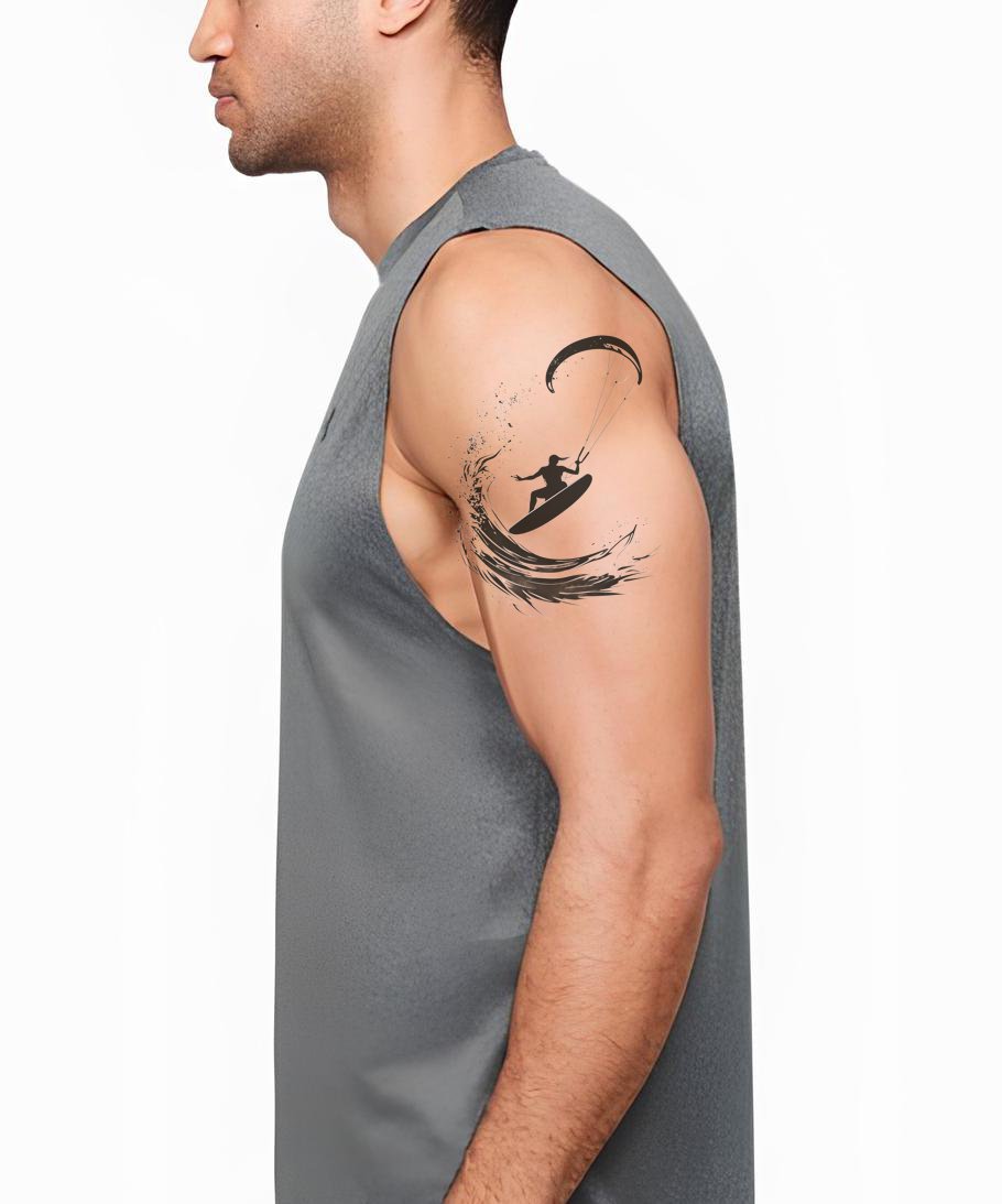 Чёрно-белые брызги в виде полумесяцев переходят в волну, кайтер изгибается в небо под натянутым кайтом — всё движение, море и экстремальный подъём. Волна символизирует стойкость и возвращение; кайтер — свободу. Ощущается мужество солёного ветра. Идеальное место: предплечье для потока; икра повторяет изгиб; рёбра подходят для дуги; лопатка раскрывается.
