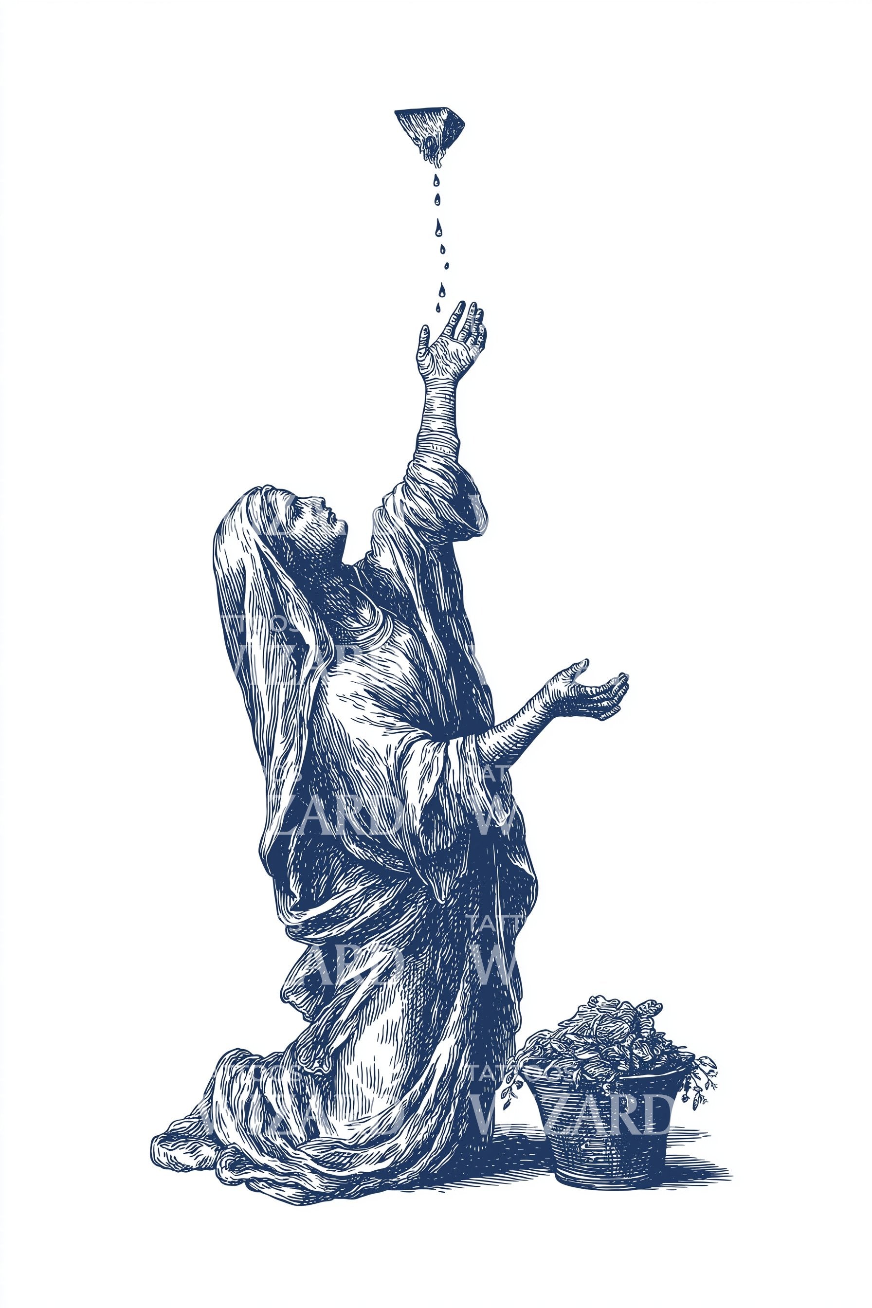 Погрузитесь в божественную веру с этим тату-дизайном в стиле эскиза. Он прекрасно изображает молитвенное преклонение, наполненное глубокой верой и духовностью. Созданный с помощью изящных штрихов пера и эфирного оттенка синего, этот художественный образ отдает дань святой спокойствию и силе.
