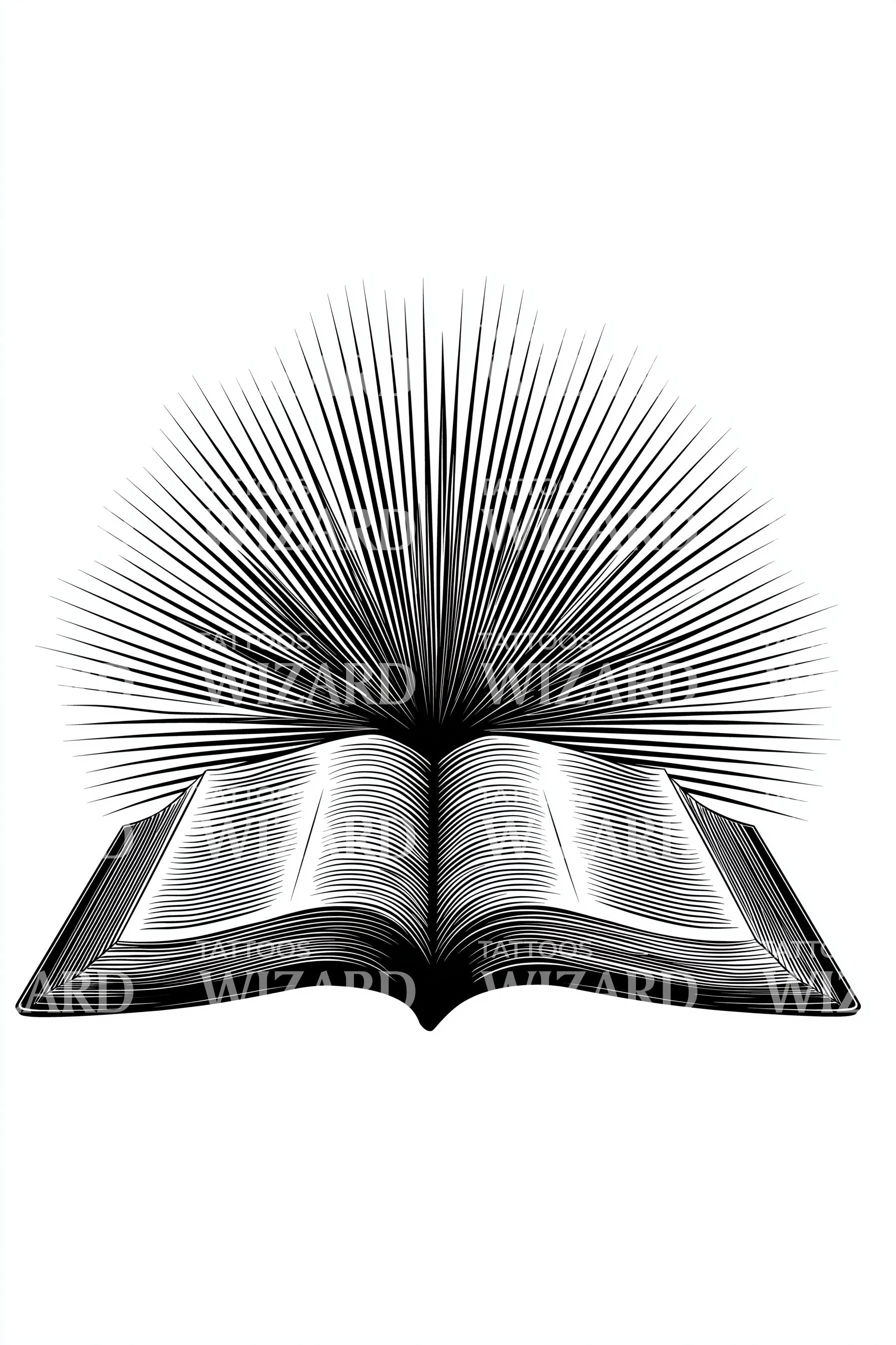 Погрузитесь в глубину мудрости с этим дизайном татуировки в стиле blackwork. В центре — изумительная сетка с изображением книги, символизирующей знание, окружённой божественными лучами света, — идеальное воплощение просветления. Позвольте этому художественному рисунку на коже выразить ваш путь к мудрости и знаниям.
