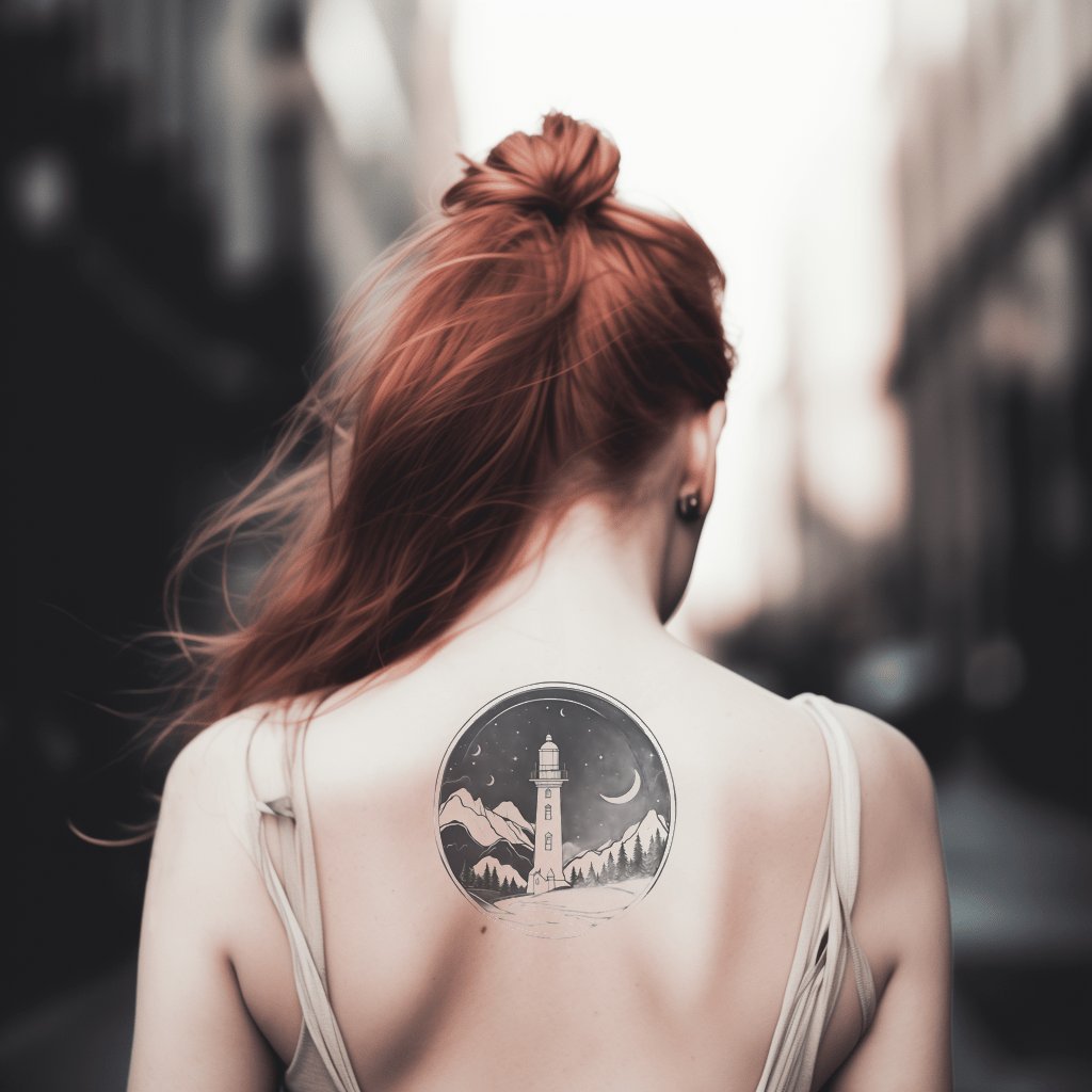 Тату-дизайн с пейзажем, маяком, луной, облаками и деревьями