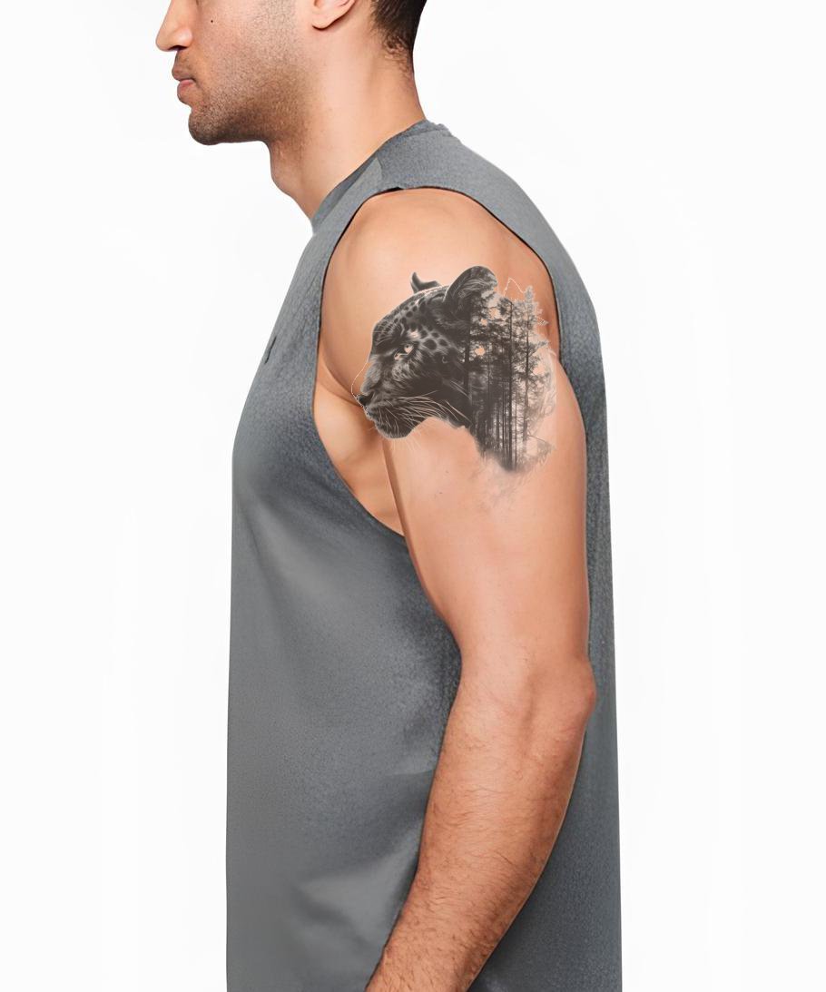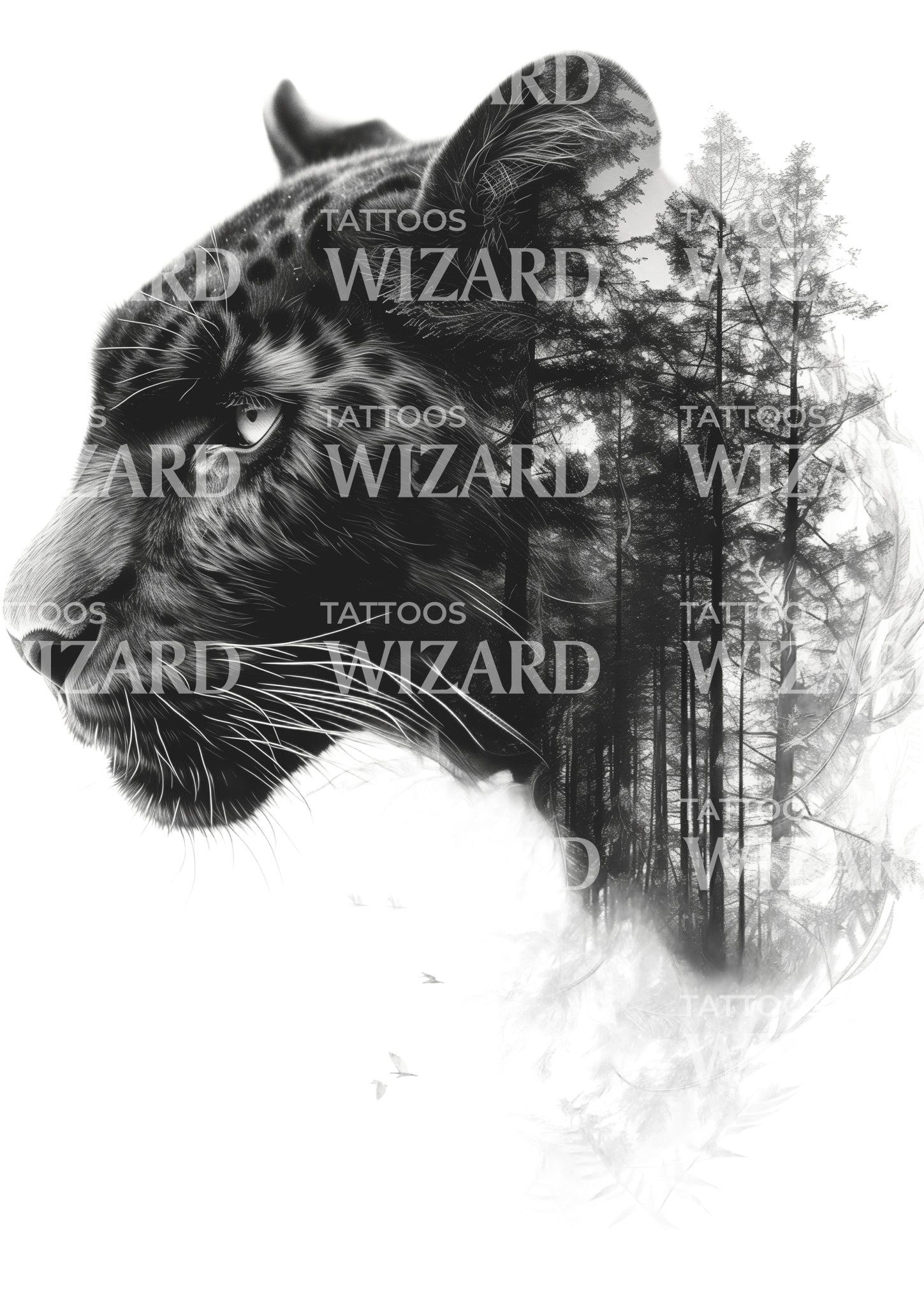 Освободите своего внутреннего хищника с этим исключительным тату-дизайном в черно-серых тонах. Он мастерски передает величественную привлекательность леопарда или пантеры, воплощая мистику и силу этих завораживающих кошачьих охотников. Поистине, впечатляющая дань красоте и мощи самых грозных млекопитающих природы.