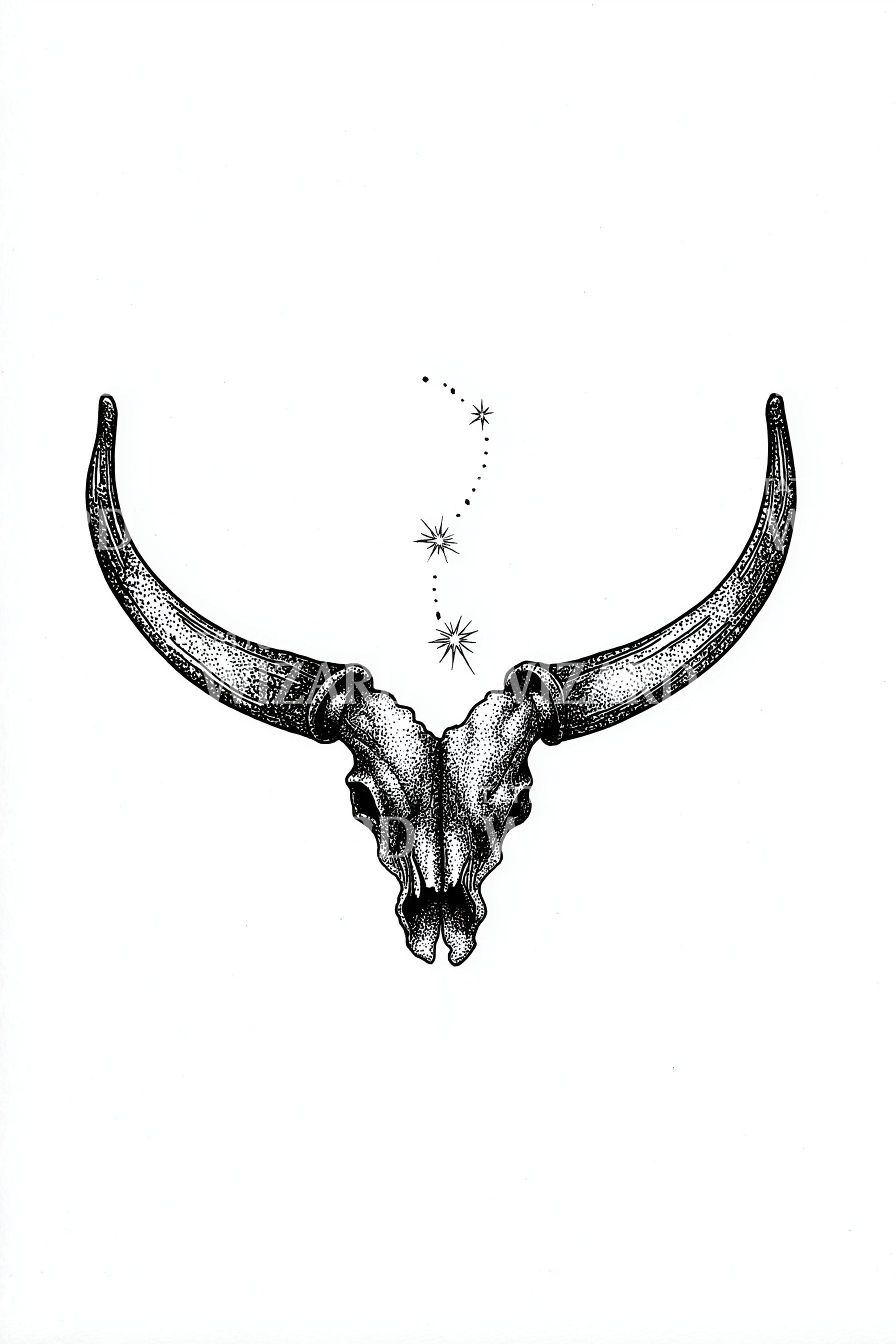 Stark dotwork longhorn skull spreads clean, sweeping horns, crowned by a trail of tiny stars. Minimal Western lines meet textured realism, honoring grit and open horizons. Symbol of endurance, instinct, and wild wisdom, this design settles like quiet strength, gifting its wearer grounded calm and night-sky courage.