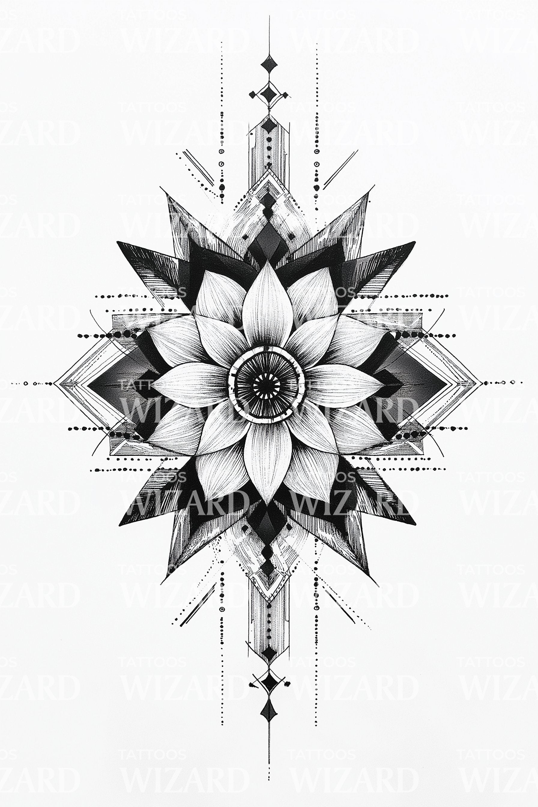 Откройте для себя своё духовное пробуждение с этим смелым, чёрным, геометрическим тату дизайном мандалы. Он завораживающе объединяет спокойствие лотоса и универсальность звезды. Созданный с тонкой детализацией, его гипнотический узор вызывает ощущение симметрии и баланса — идеальный образ для отражения вашего внутреннего пути.