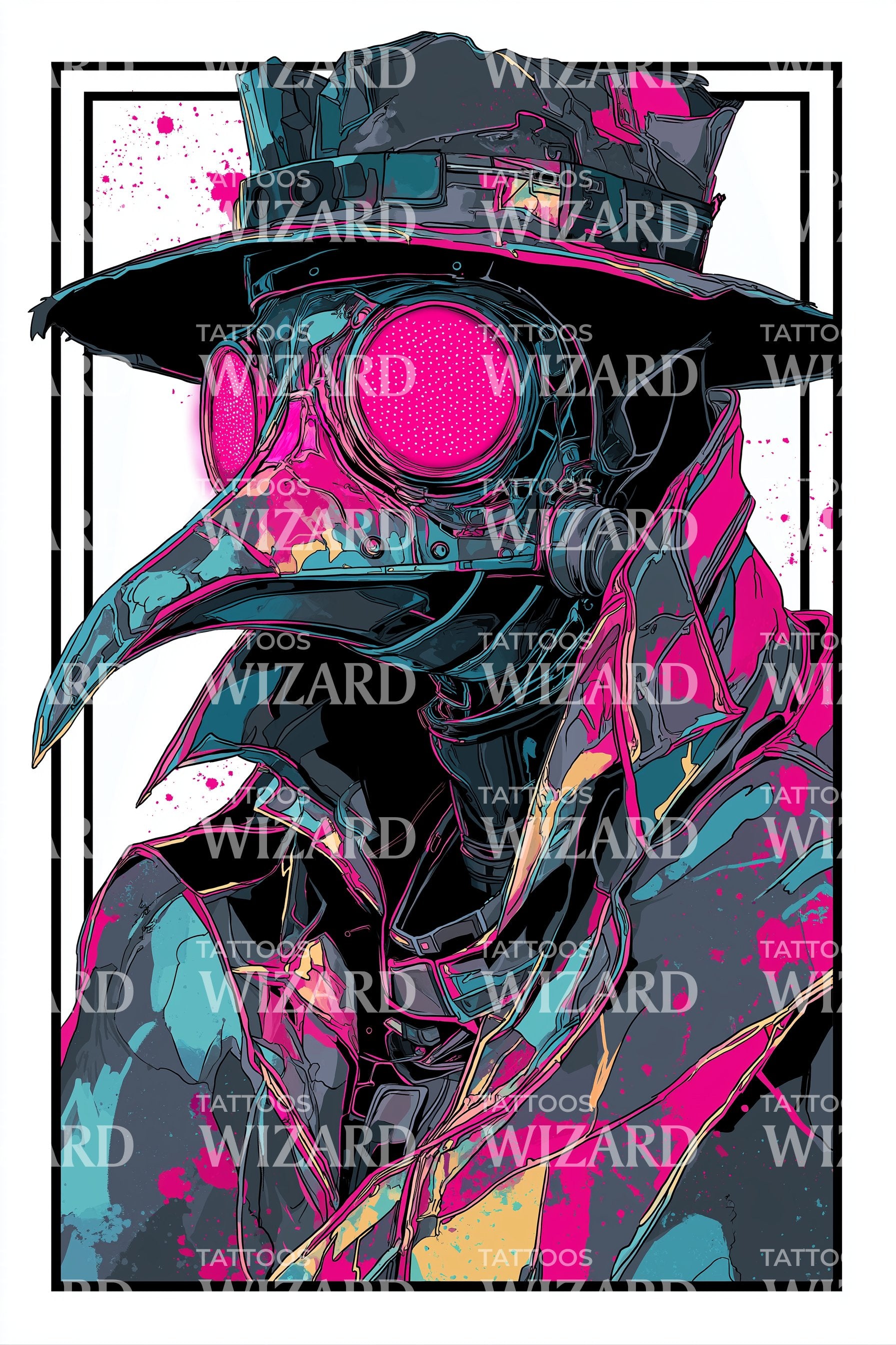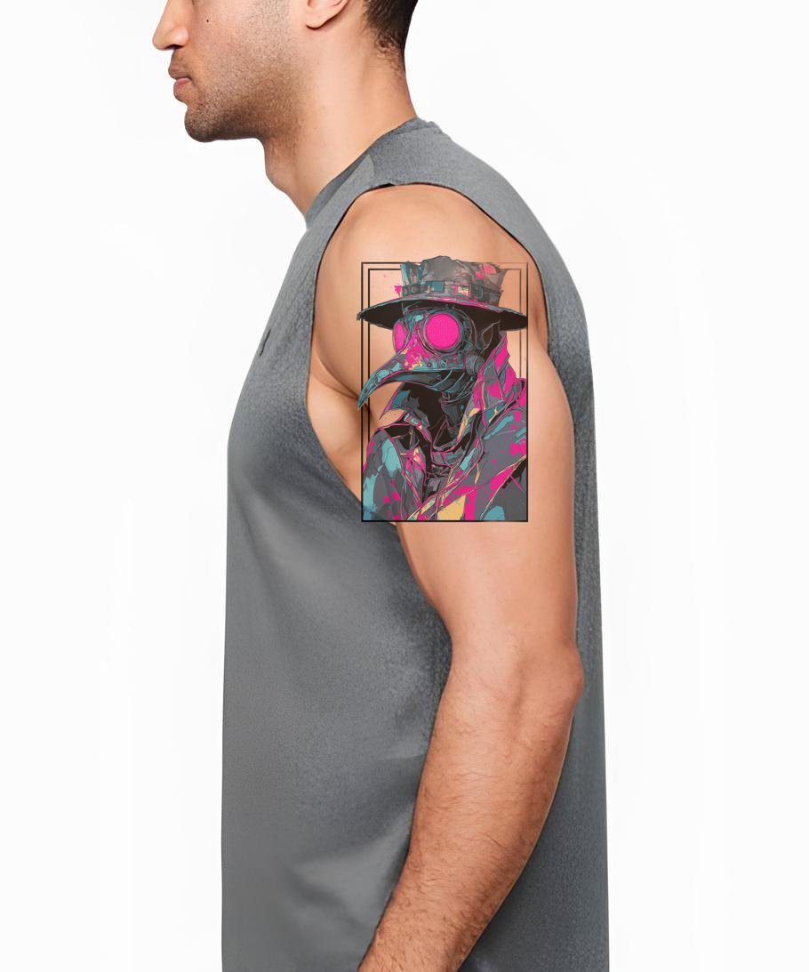 Погрузитесь в уникальное слияние истории и искусства с этим тату-дизайном в стиле newschool. Темно-завораживающий, он изображает чумного доктора в маджентовом наряде, с маской, раскрашенной выразительными цветными мазками. Это смелое произведение, напоминающее о несгибаемом человеческом духе.