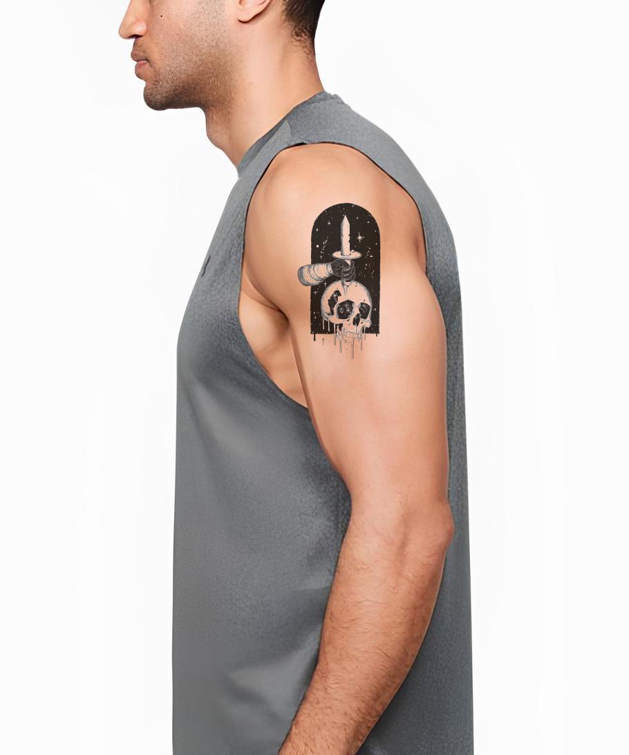 Исследуйте бескрайние просторы космоса и бренность бытия с этим современным тату-дизайном в черно-серых тонах. Он изящно объединяет эфирные тайны космоса с земным черепом, символизируя вечный человеческий поиск знаний. Этот оригинальный рисунок несомненно добавит уникальное очарование вашему стилю.