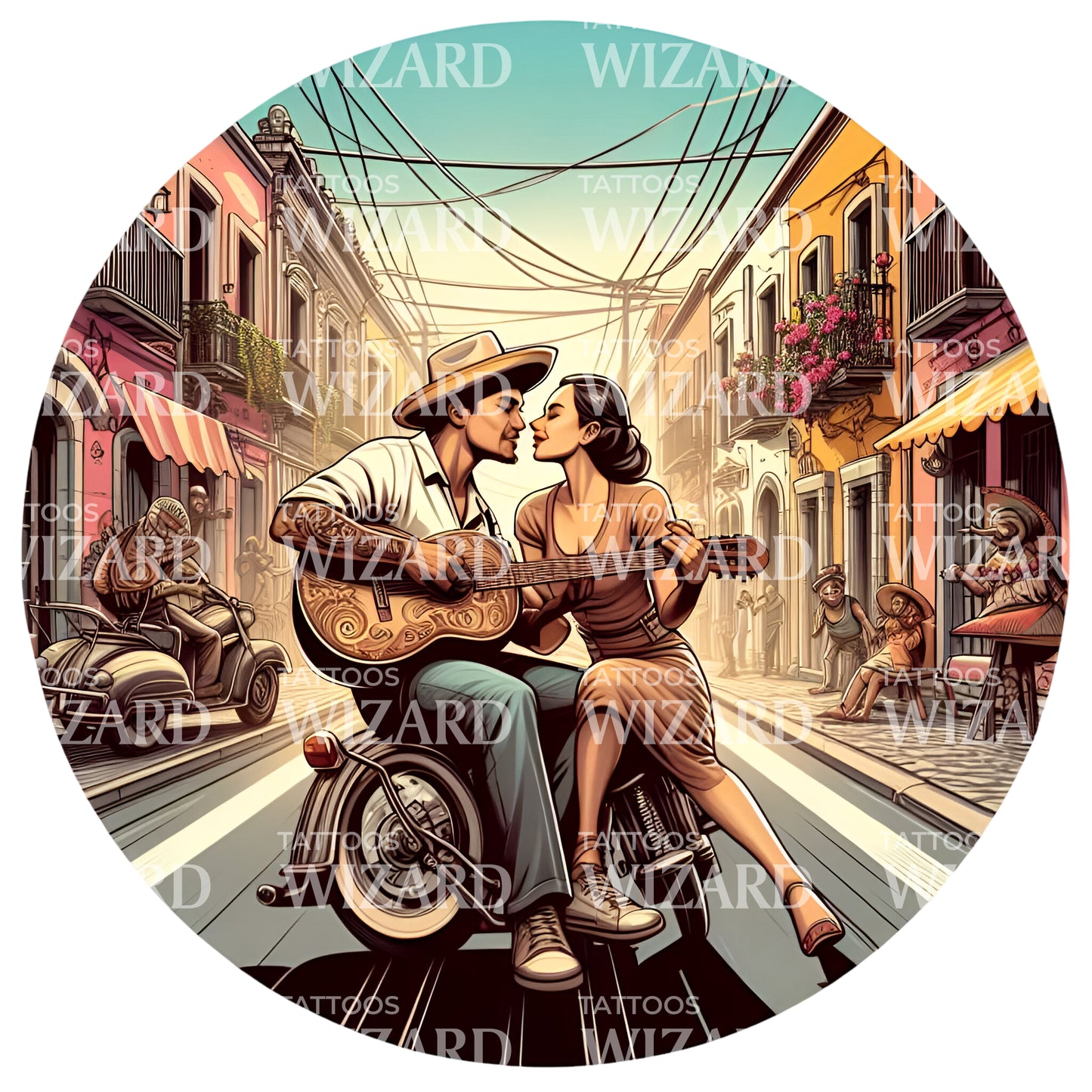 Погрузитесь в расслабленную атмосферу этого иллюстративного тату-дизайна, излучающего романтическое очарование. Созданный с элементами, вдохновлёнными мексиканским праздничным настроением, он является идеальным символом для тех, кто ценит непринуждённые музыкальные сессии. Смелое, выразительное заявление, запечатлённое в чернилах.