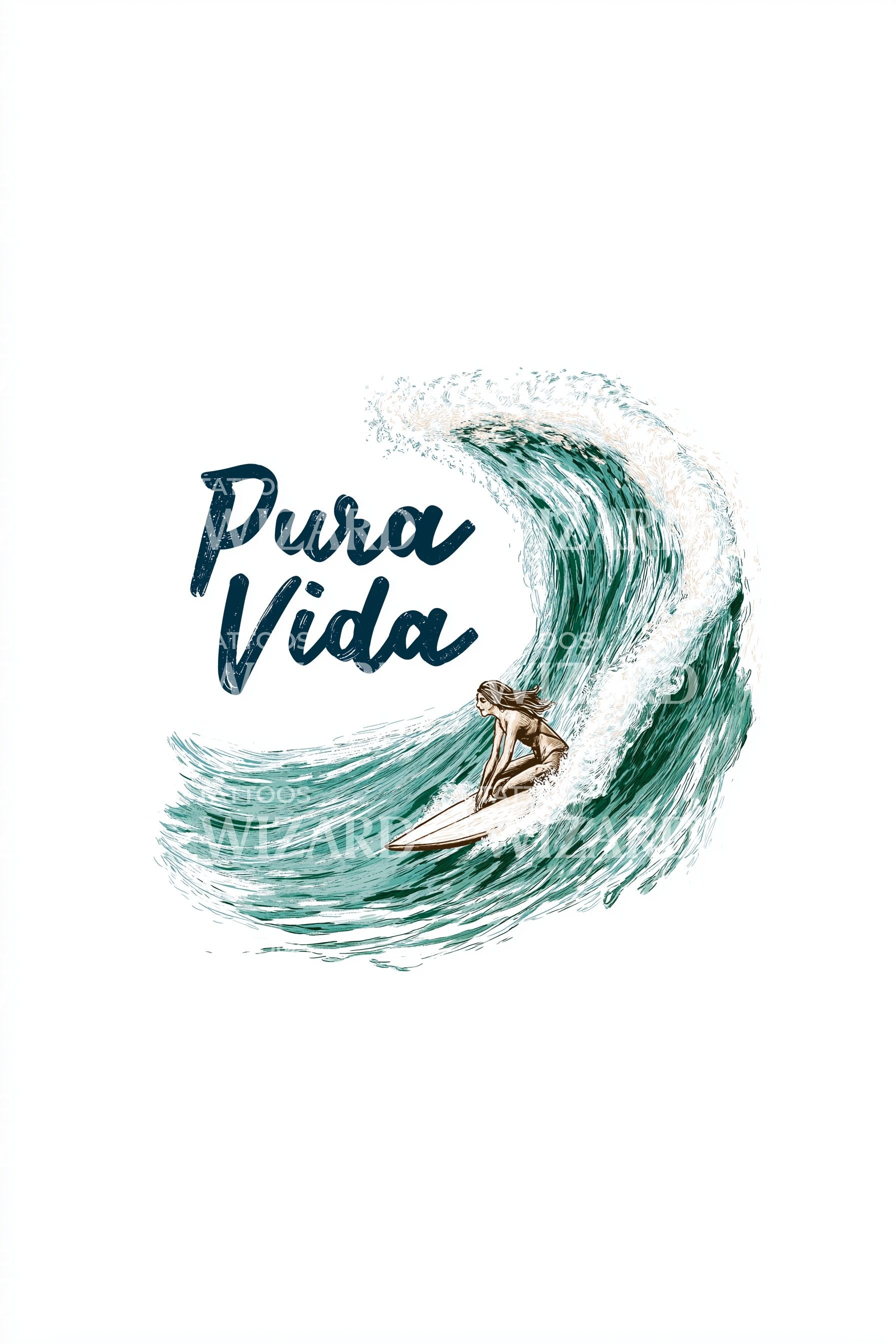 Teal surf spirals into a clean, minimal wave, curling around hand-lettered Pura Vida. Brushed lines and soft foam textures keep the composition light and airy. Symbolizing flow, freedom, and renewal, it honors ocean rhythm. Wearing it feels calm, courageous, and alive, a daily tide of presence and joy.