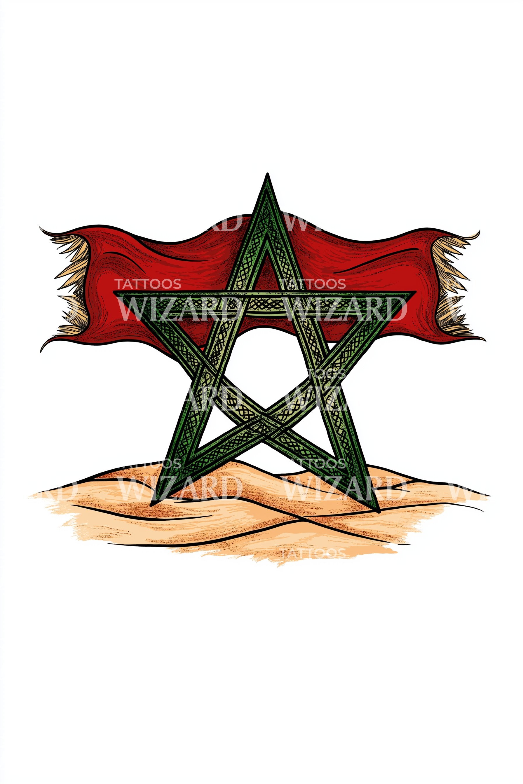Иллюстративная татуировка, вызывающая в памяти душу марокканской пустыни: развевающийся баннер, словно ветер над колышущимся песком, обрамляет знаковую зелёную звезду с флага. Солнечные оттенки, состаренные текстуры и тонкая линия создают ощущение движения и гордости. Идеально подходит для путешественников, хранителей наследия и ценителей североафриканской символики и традиций.