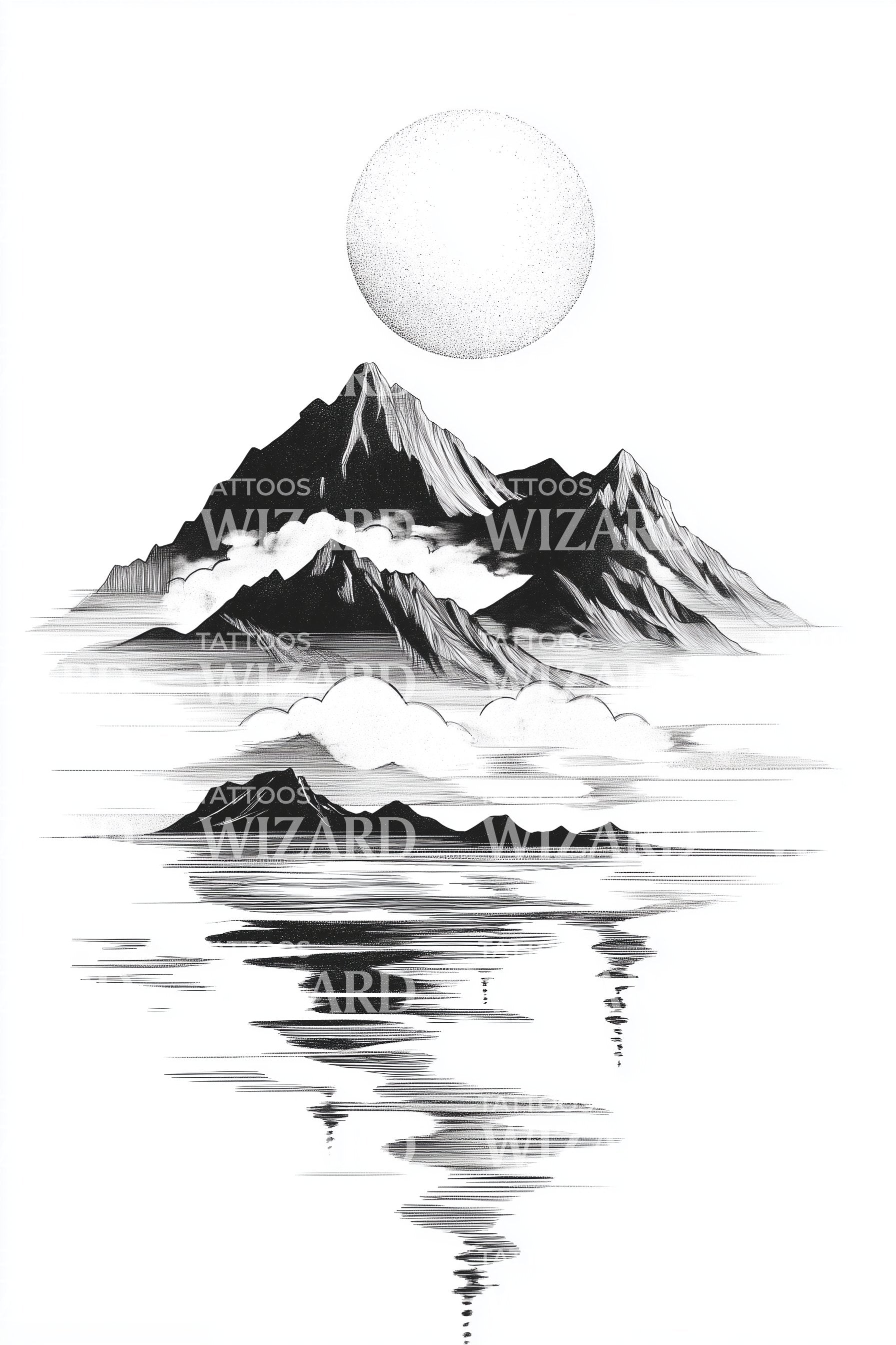 Освободите свою любовь к природе с этим стильным черно-серым тату-дизайном. Он мастерски демонстрирует спокойную красоту горного пейзажа, акцентируя внимание на зеркальных отражениях. Впечатляюще детализированный, он воплощает завораживающее очарование нетронутой дикой природы, идеально подходя для тех, кто восхищается величием природы.