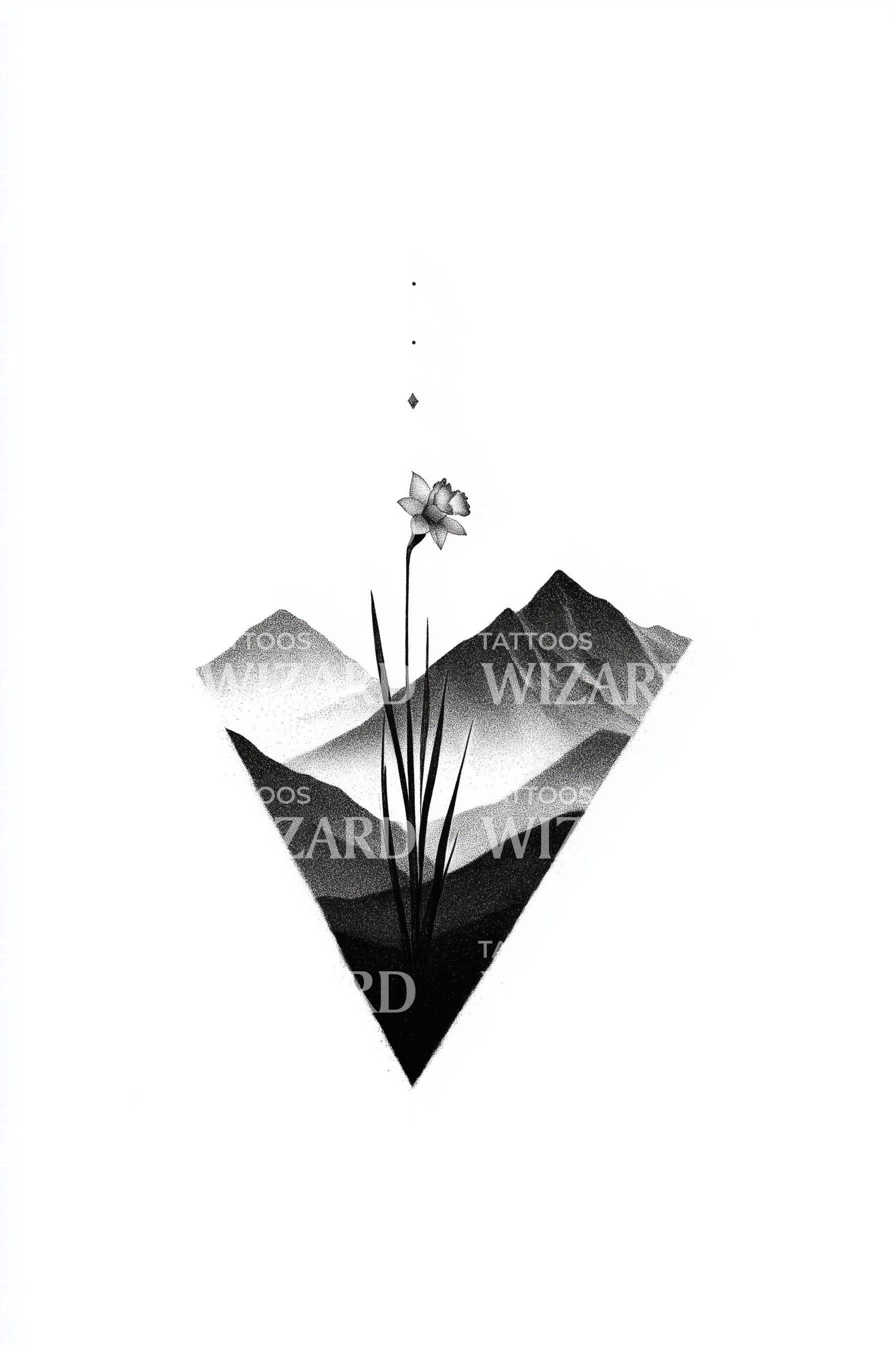 Погрузитесь в гармонию природы с этим геометрическим тату-дизайном. Мастерски выполненный, он передаёт величие гор, острую красоту алмазов и изящную грацию цветов, всё в минималистичном пейзаже. Идеальное сочетание органической и геометрической эстетики для тех, кто чтит оба начала.