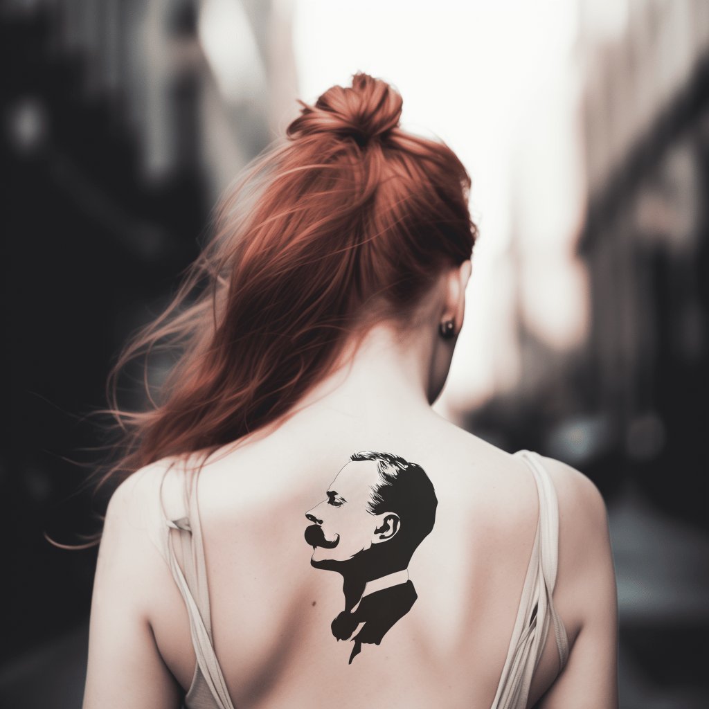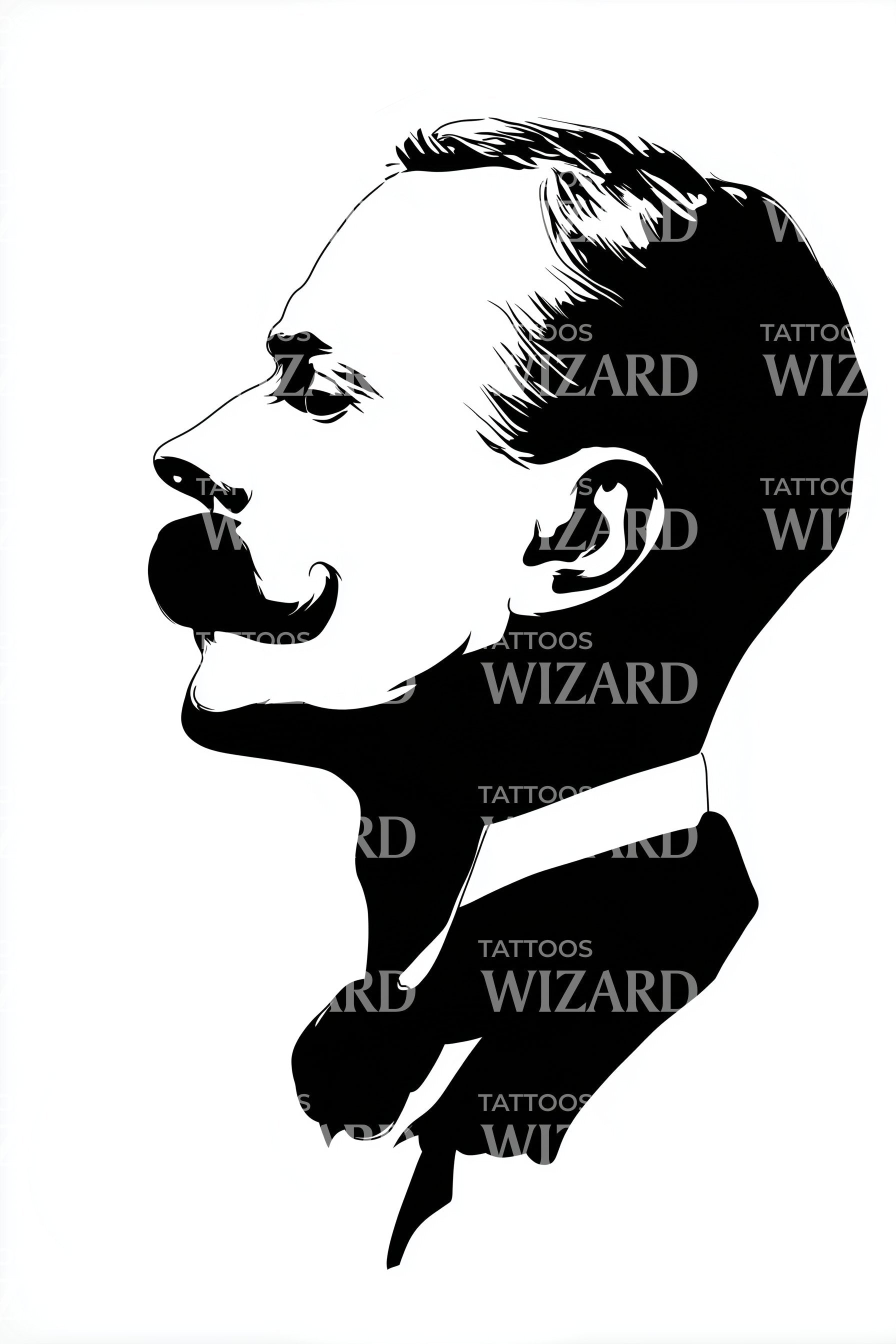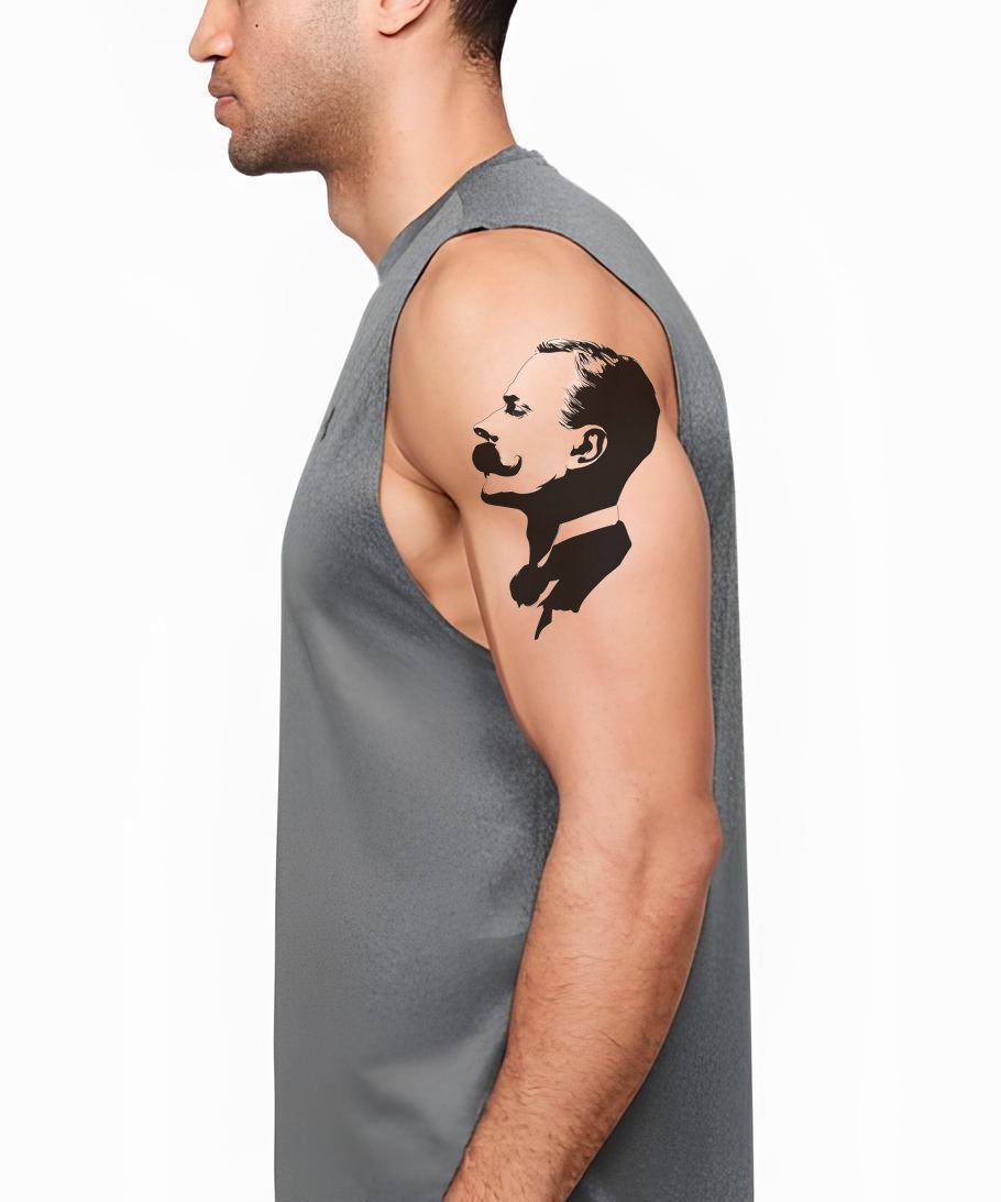 Погрузитесь в вечную привлекательность с этим ретро-стилизованным тату в технике blackwork. Классический профиль джентльмена, украшенный выразительными усами, излучает атмосферу утончённой изысканности. Блестящее сочетание традиционного и современного искусства, этот дизайн добавит вашей коллекции неповторимый винтажный шарм.