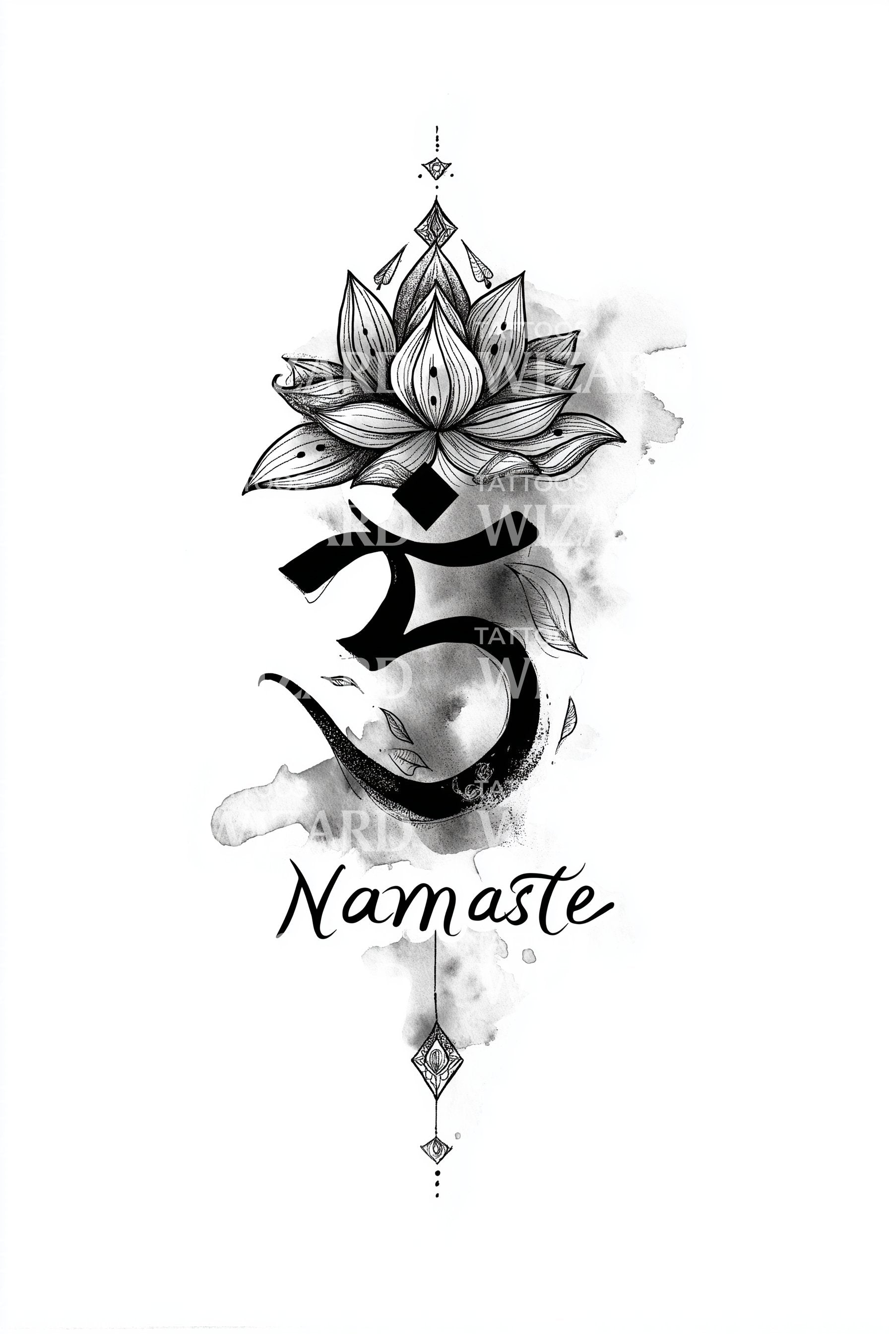 Fineline petals bloom into a sacred lotus above a bold Om, brushed with soft watercolor shadows and delicate geometric accents. Symbolizing purity rising from stillness, universal vibration, and the greeting Namaste, this piece invites yogic presence. Wearer feels centered, open-hearted, and spiritually aligned on every steady breath taken.