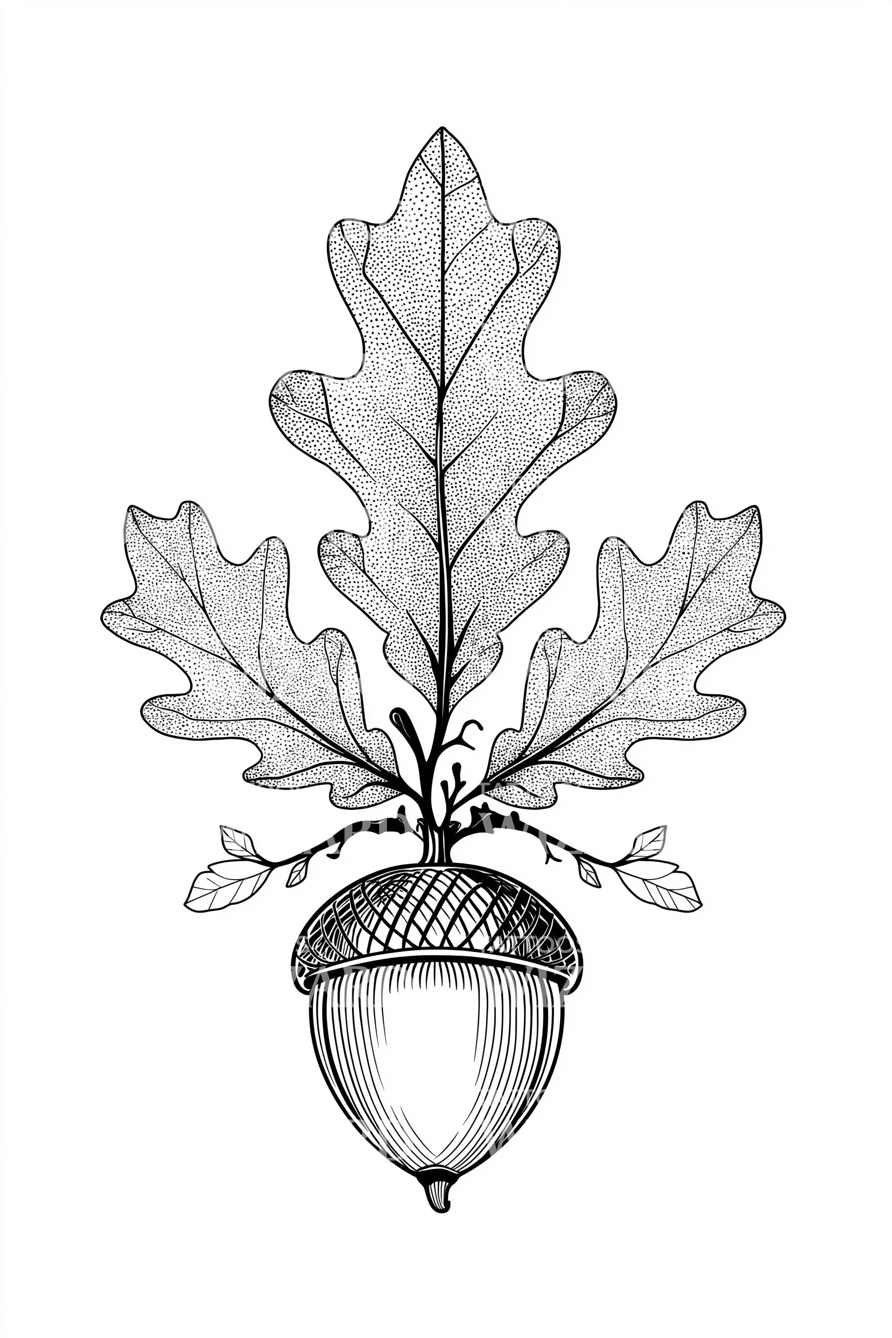 Botanical blackwork captures an acorn crowned by three veined oak leaves, rendered in delicate line and stippled shading. Symbol of strength, patience, and becoming, the tiny seed holds forests within. Wear it to feel rooted, resilient, and quietly wild, carrying nature’s steadfast wisdom on your skin, every day.