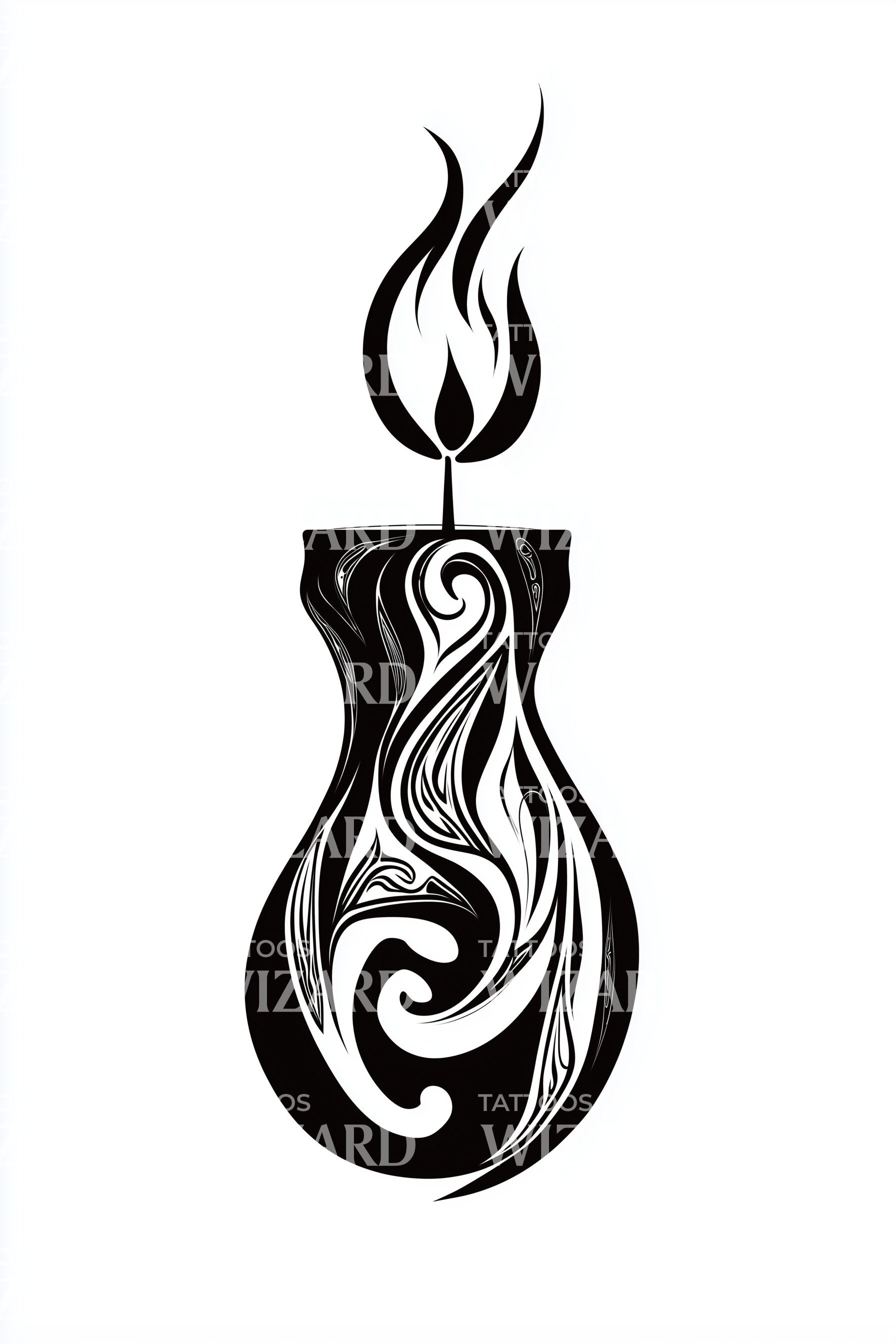Освободите мощную эстетику с этим татуировочным дизайном в стиле трайбл. Символизируя классическую лампу, он изящно переплетает мотивы масла и пламени, передавая глубокое чувство вечного света. Излучая интенсивный трайбл-стиль, этот дизайн идеально подходит для смелого и вечного выражения в искусстве тела.
