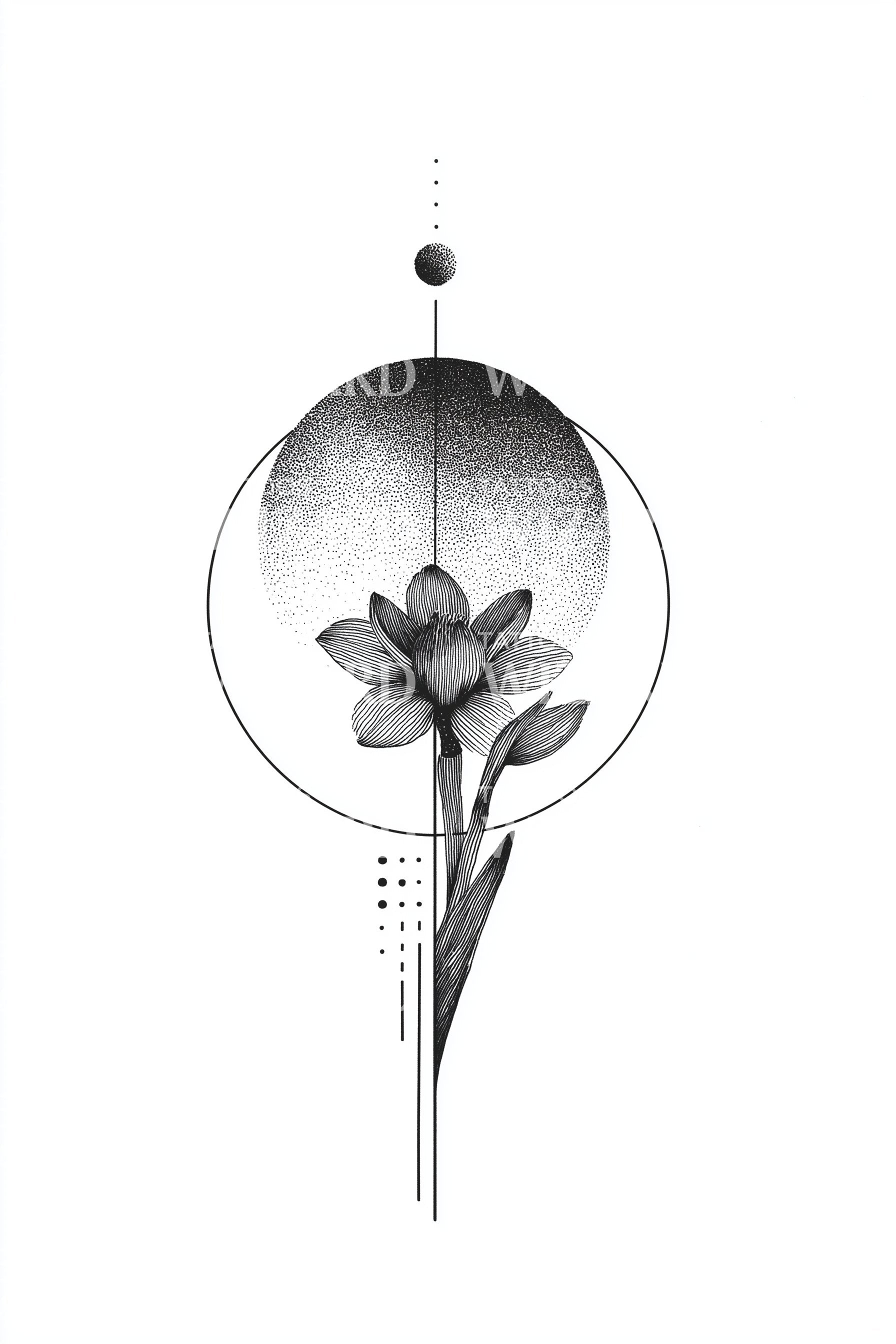 Этот изысканный дизайн татуировки сочетает эстетику дотворка с минималистичной дзен-атмосферой. В центре — элегантно штрихованный шар, на котором изображён очаровательный нарцисс — выполненный с поразительной детализацией и простотой. Идеально подходит для тех, кто ищет спокойный, но выразительный знак личного самовыражения.