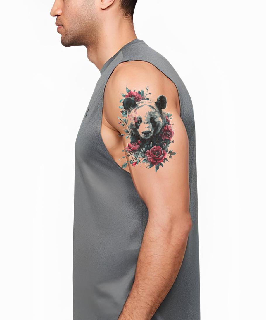 Татуировка с пандой, розами и пионами - идея дизайна