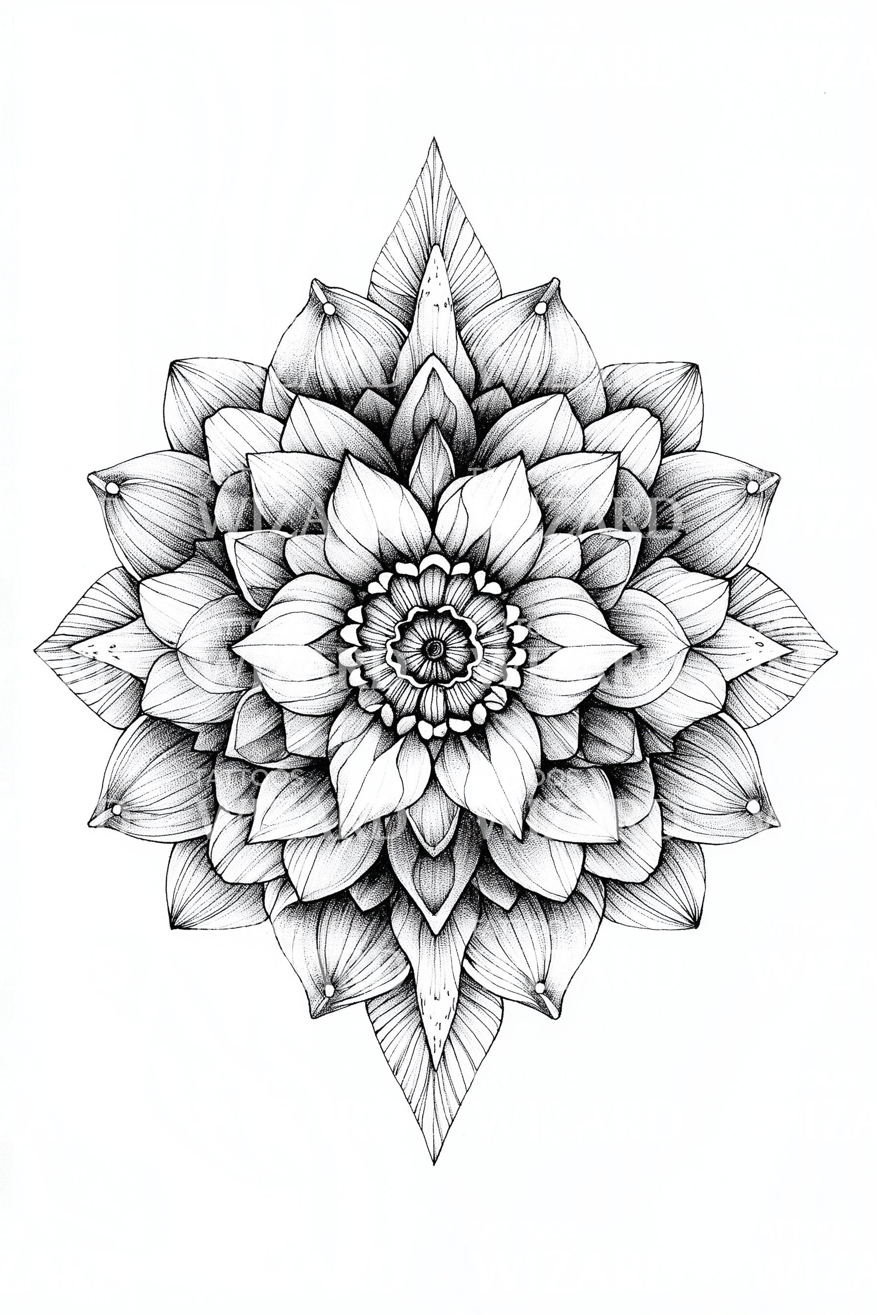 Ощутите очарование спокойствия с этим дизайном татуировки мандалы из лепестков. Наша изящная точечная техника добавляет сложный слой утончённости, тонко воспевая естественное цветение цветка. Идеально подходит тем, кто хочет выразить элегантность и умиротворение через искусство на теле.