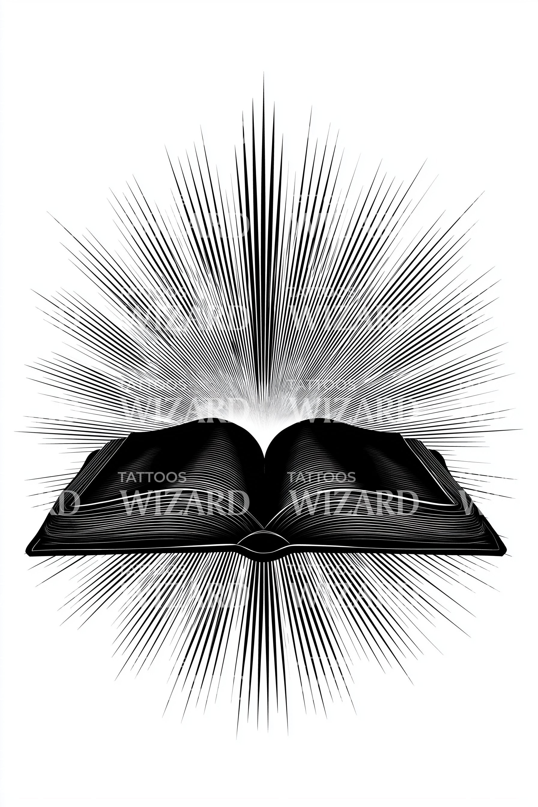 Погрузитесь в божественное сияние с этим сложным дизайном татуировки в стиле blackwork. Вдохновлённый священным писанием, этот шедевр изображает сияющую книгу, символизирующую веру и просветление. Гарантированно вызывает глубокие чувства, это уникальное выражение духовности и священного света.