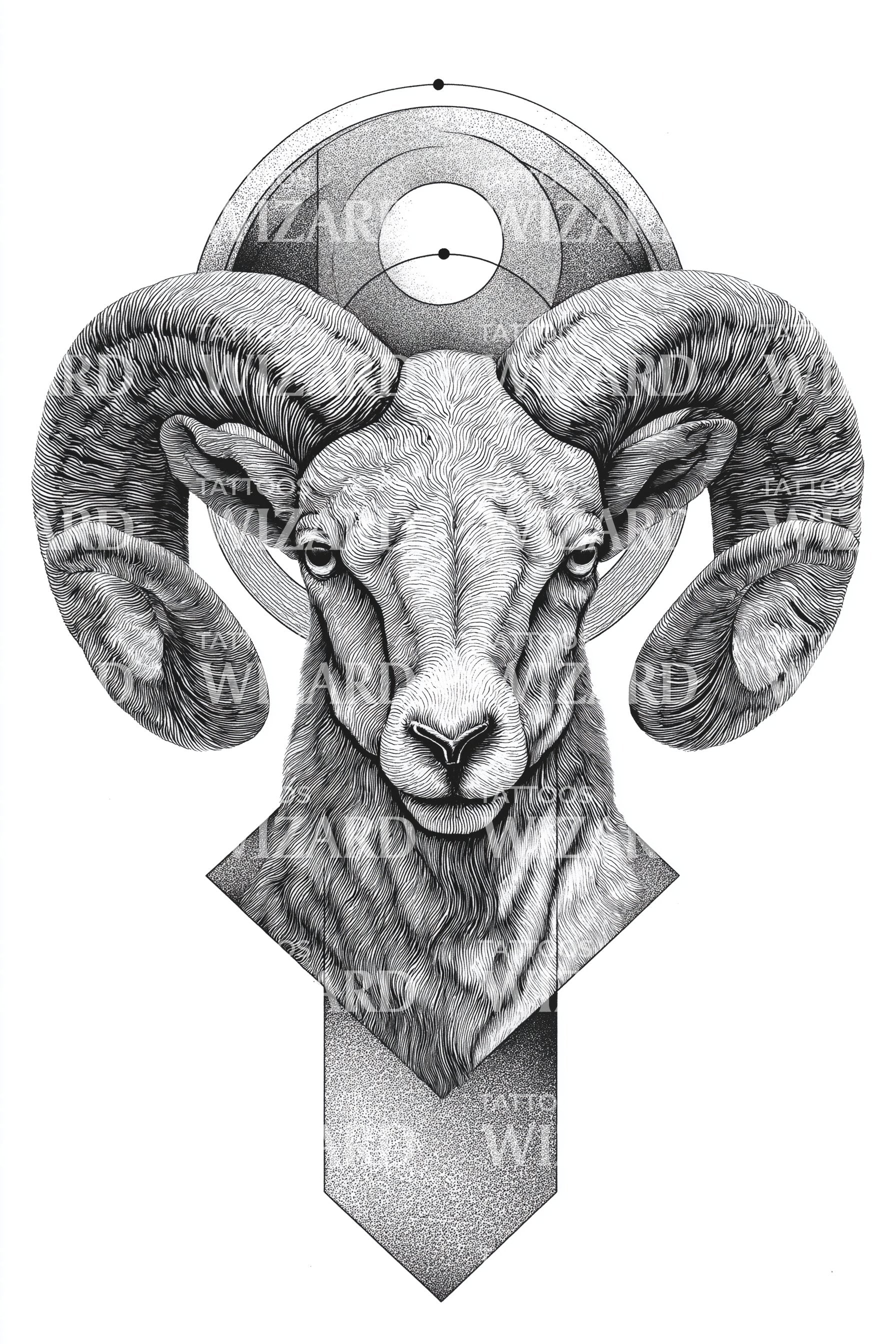 Геометрический нимб и рамка в виде шеврона обрамляют барана; рога закручиваются в точечную геометрию. Эмблема сырой силы, приземлённого инстинкта, бесстрашного восхождения, этот дух черепа козла олицетворяет стойкость. Носить его ощущается как уверенность, сосредоточенность, неудержимость. Лучшие места: грудина для потока, верхняя часть руки для обёртывания, центр спины для симметрии, икра для сужения.
