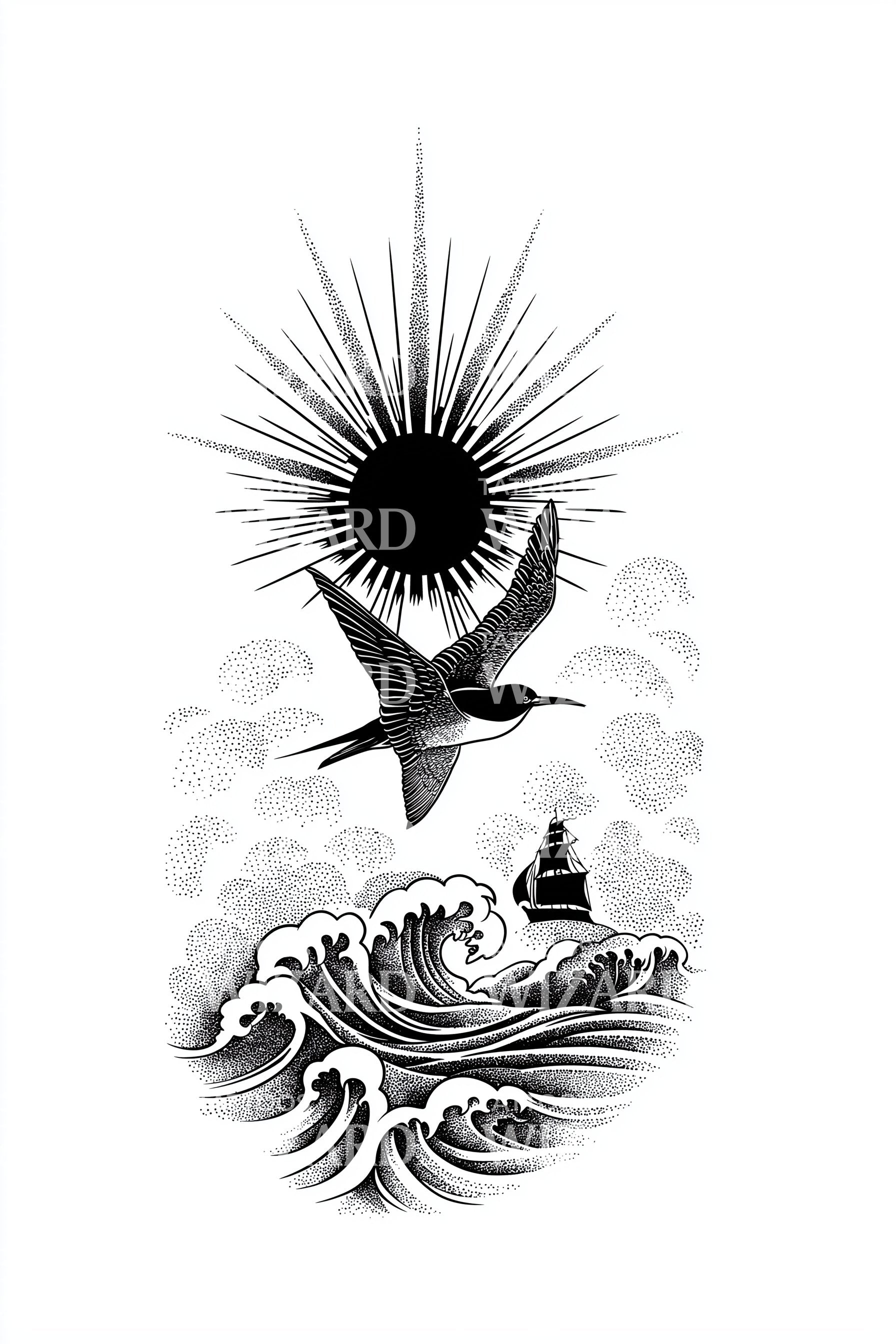 Вырезанная в выразительных черно-серых тонах, эта татуировка изображает морскую птицу, парящую на фоне затмения, крылья которой прорезают лунные волны. Океанские волны обнимают сцену, смешивая тень и свет. Вневременной символ свободы, стойкости и движения — минималистичный, но выразительный, идеально подходит для рукавов, плеч, грудины, спины или ребер.