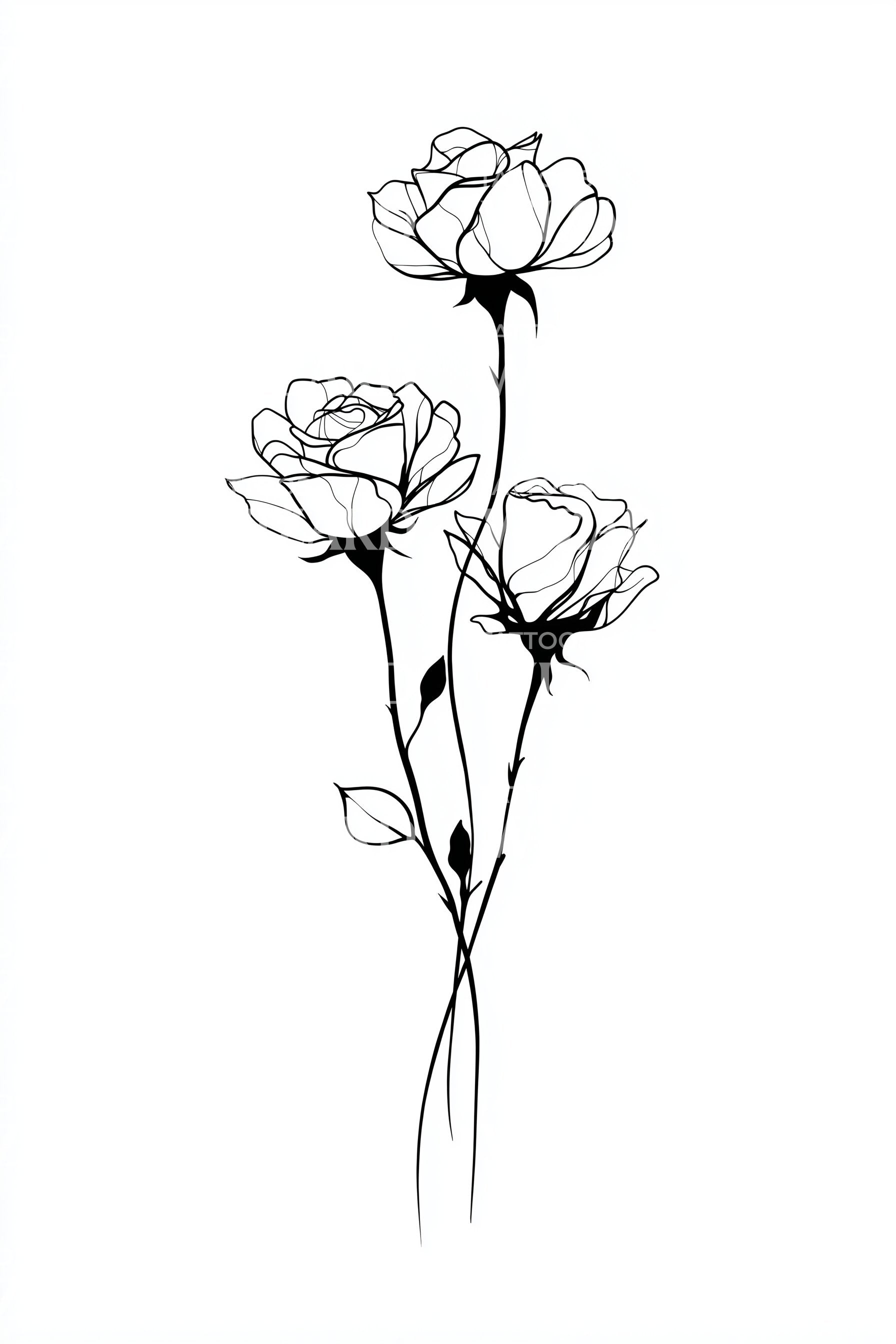 Delicate fineline roses rise on slender intertwining stems, petals outlined with airy precision, leaves pared to essentials. Three blooms suggest stages of growth, honoring resilience, love, and renewal. A minimal botanical keepsake that feels calm and elegant, inviting quiet strength, soft romance, and everyday grace on the skin.