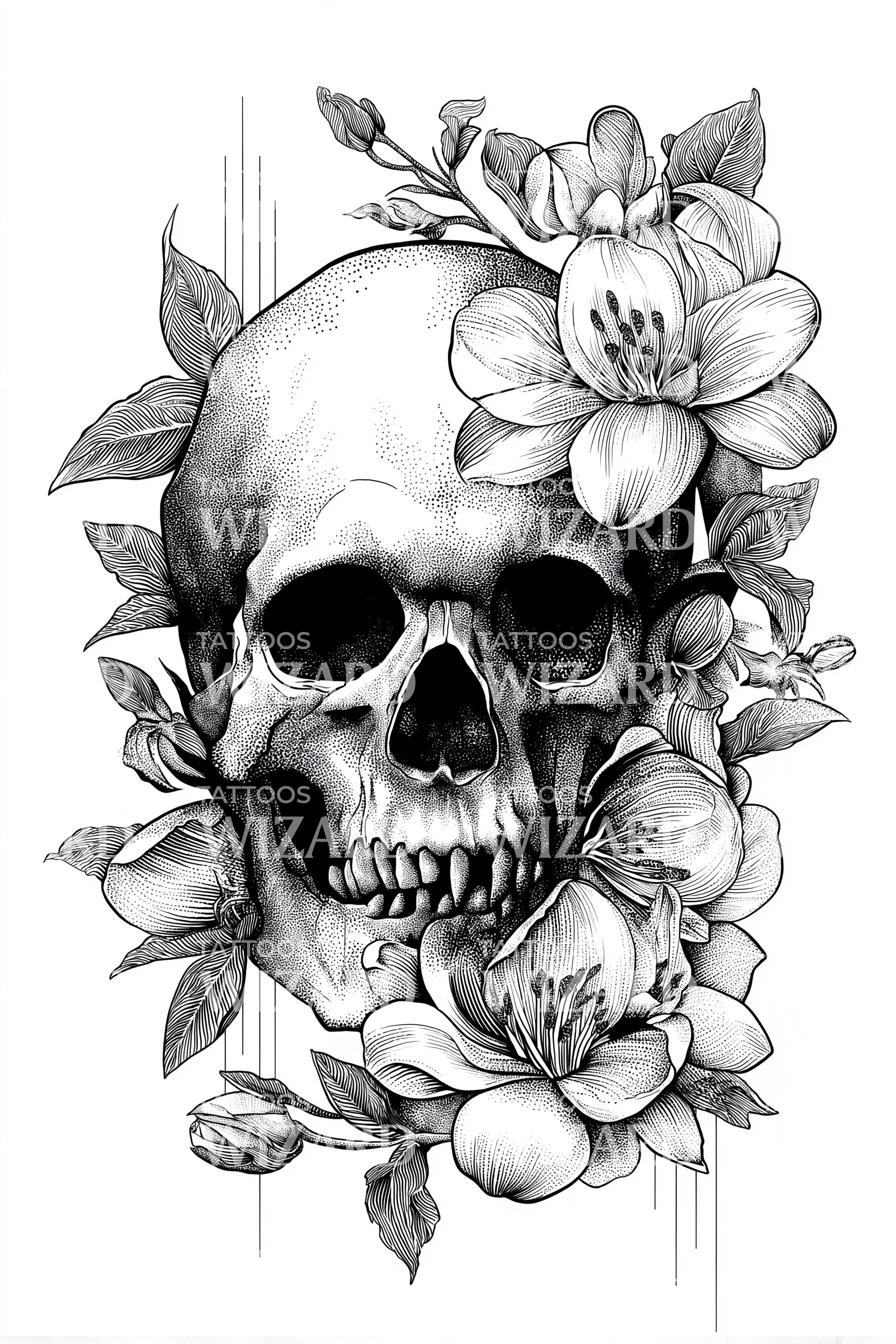 Погрузитесь в тонкий баланс жизни и смерти с этим черно-серым тату-дизайном. Он изображает завораживающий череп, бережно оплетённый гирляндой цветущих цветов. Этот красивый символ памяти, тёмный, но элегантный, говорит многое в своей тихой торжественности.