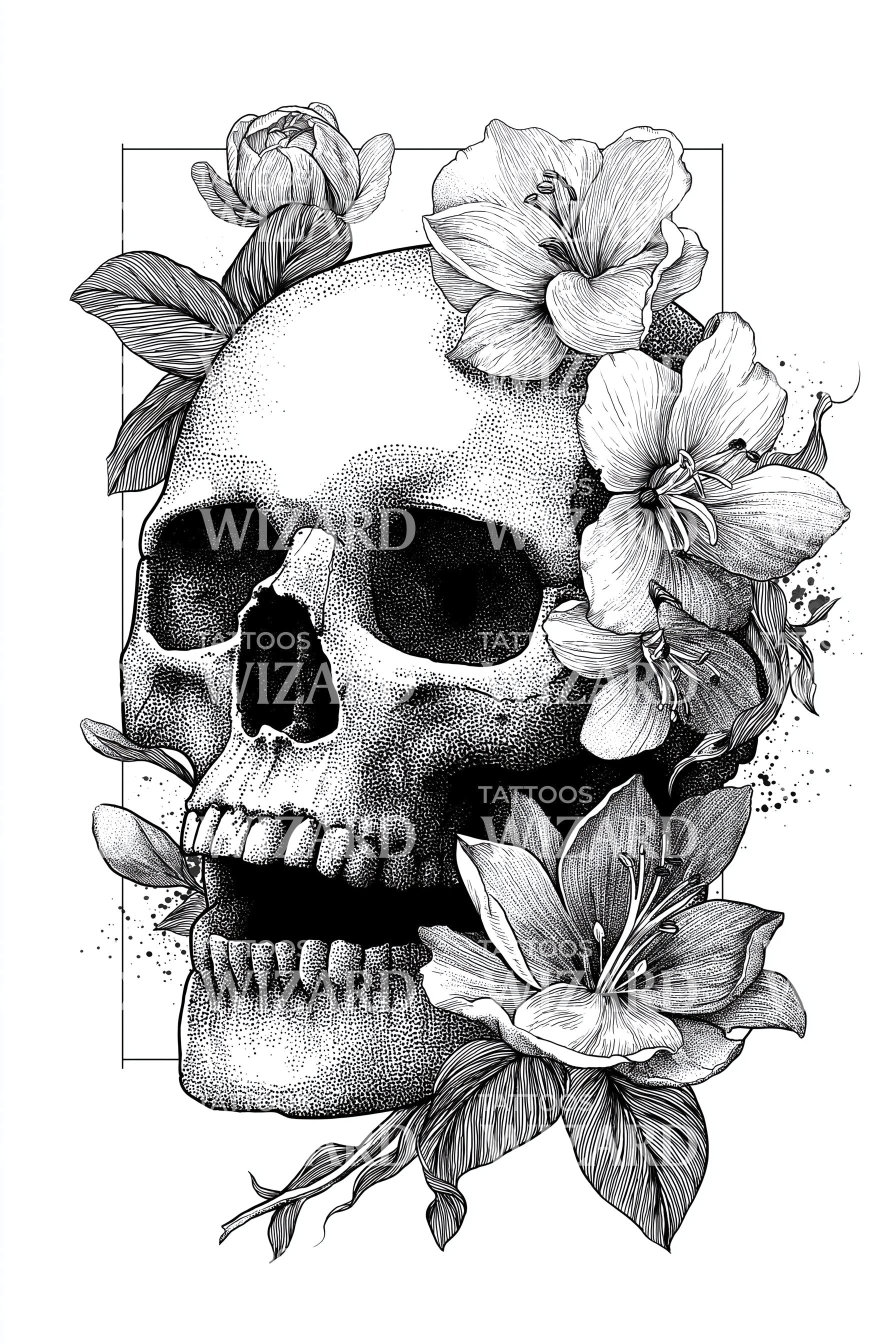 Этот уникальный черно-серый дизайн татуировки объединяет грозный символ черепа и нежные цветы магнолии, вызывая противоположные идеи смертности и красоты. Это потрясающее напоминание, сочетающее мрак смерти с цветочным обещанием жизни. Идеально подходит для тех, кто ценит глубокий, символический смысл в своем телеискусстве.