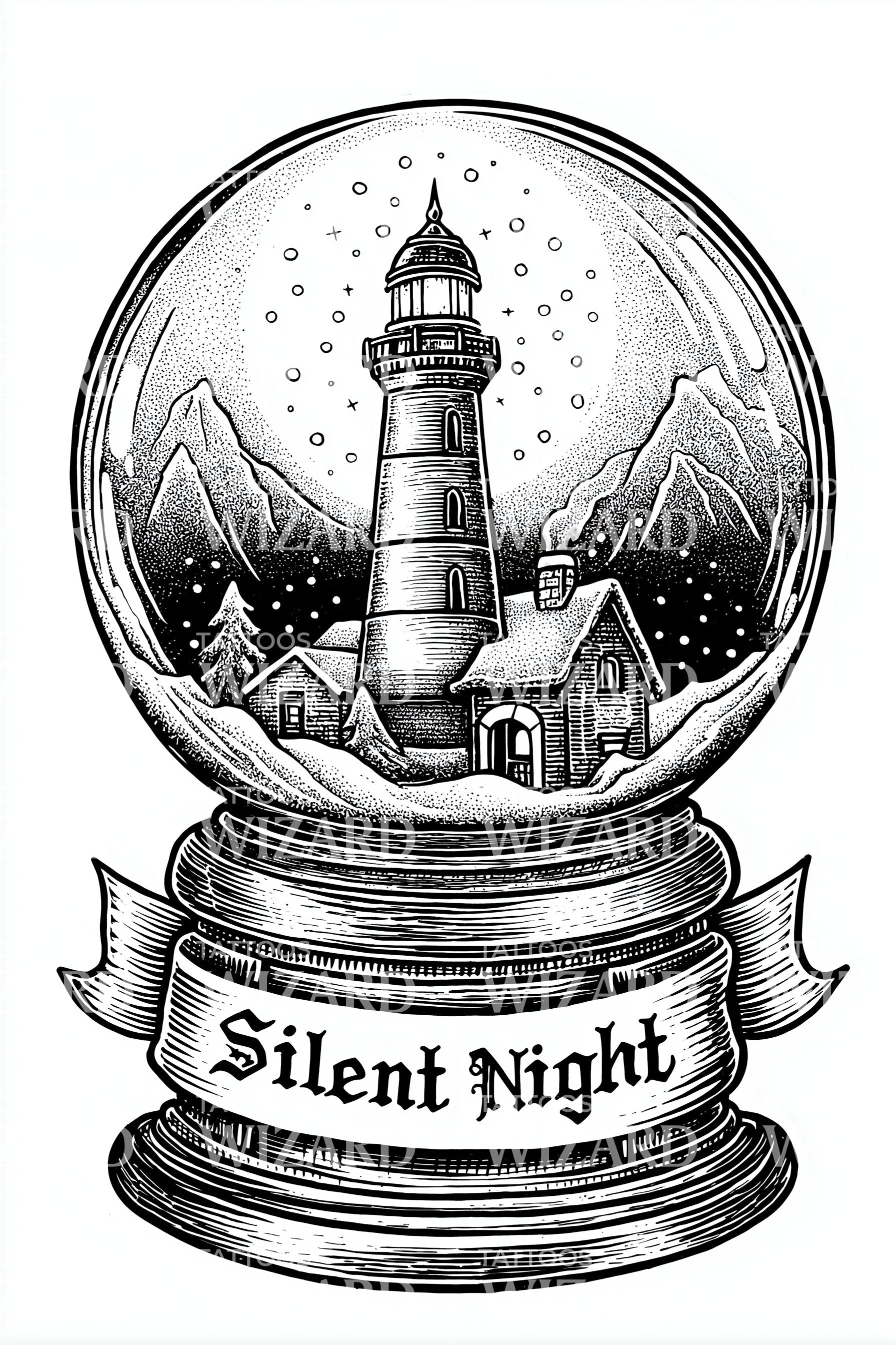 Hand-rendered in black&grey dotwork, a snowglobe cradles a lighthouse, cabin, and mountain peaks under a night scattered with stars. Guiding light symbolizes clarity through winter trials, while the snug home honors Christmas comfort and belonging. Worn on skin, it whispers calm resilience, nostalgic wonder, and a steady compass toward hope.