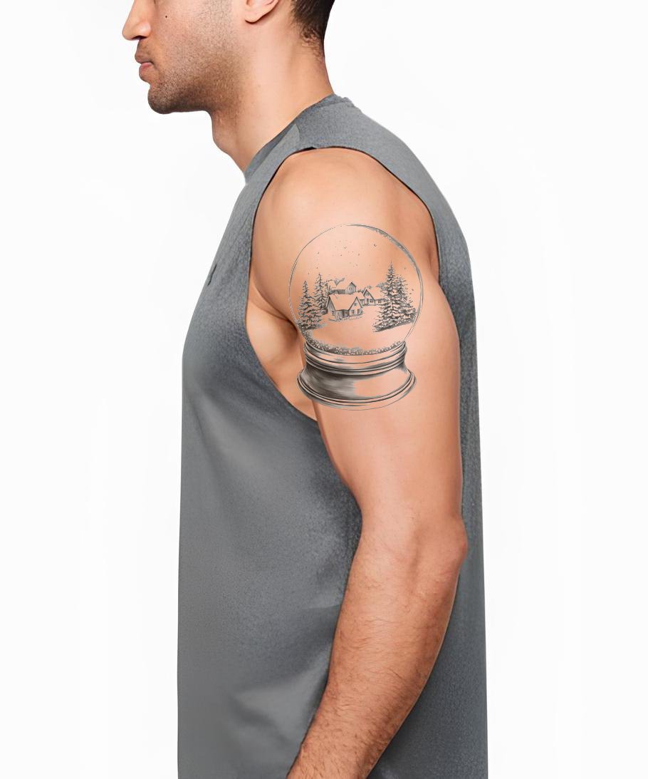 Snowglobe serenity in rich black and grey, fine lines and velvety shading cradle a quaint village among frosted evergreens. Floating snow and a classic pedestal capture time paused. Symbolizes home, protection, and cherished memories. Wears like a pocket sanctuary, inviting calm, nostalgia, and quiet winter resilience.