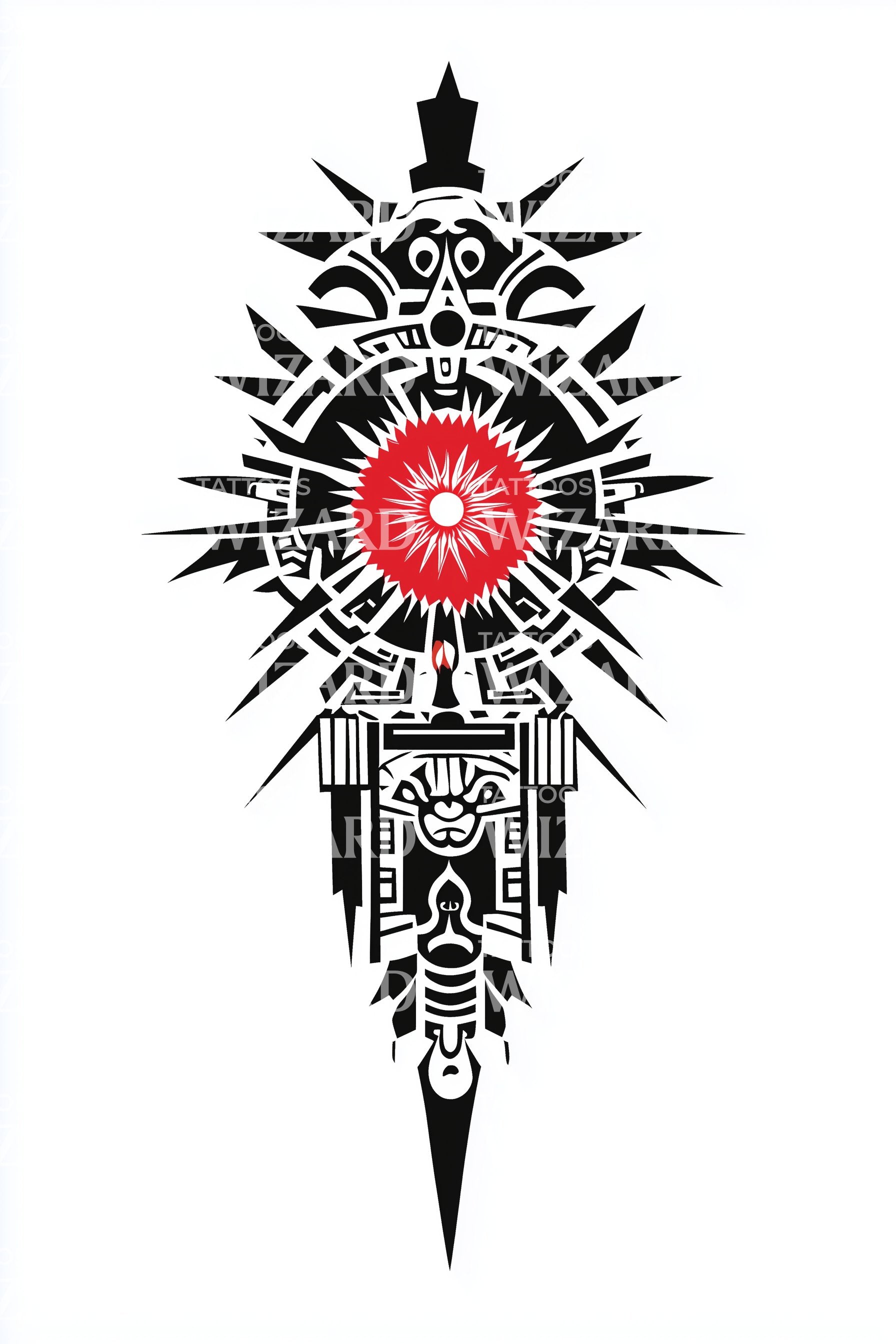 Погрузитесь в духовное единство этого дизайна тату мандалы. Основанная на священной геометрии, она ритмично переплетает символы солнца и кинжала в племенную историю. Каждый штрих вызывает мощный рассказ, резонирующий с силой солнца и остротой кинжала. Это глубокий шедевр, который ждет, чтобы быть нанесённым на ваше полотно.