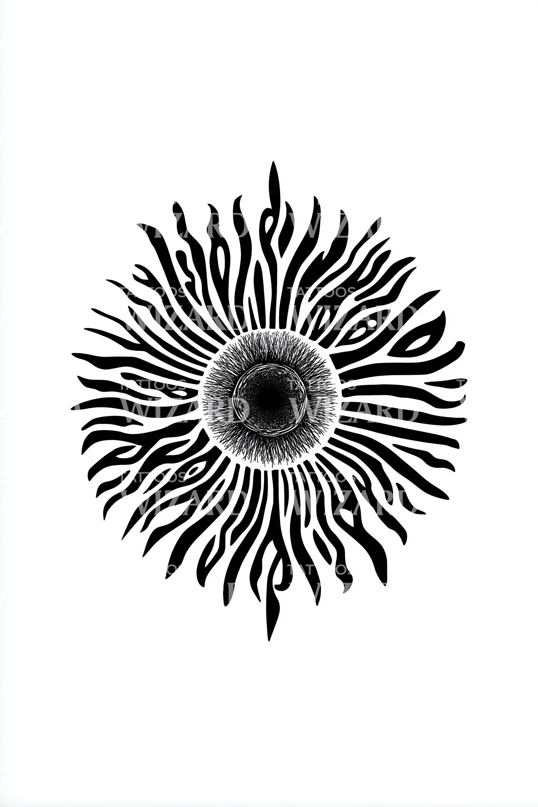 Освободите энергию космоса с этим дизайном тату мандалы. Вдохновлённый солнечной спиралью, он сочетает абстрактное величие солнца в сияющем чёрном цвете. Это гипнотическое воплощение силы, сияние, не похожее ни на какое другое. Украсьте свою кожу этим небесным, залитым солнцем зрелищем.