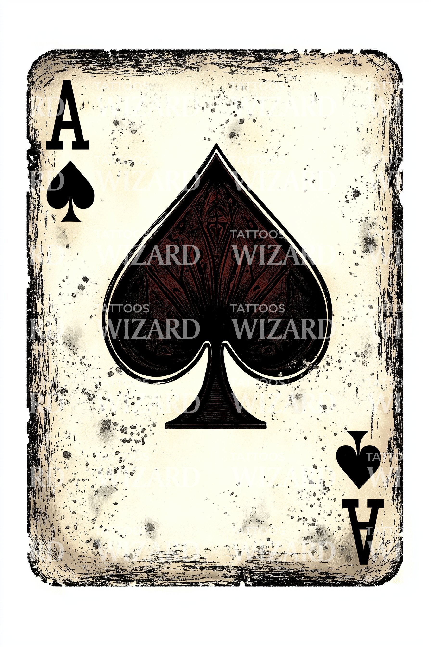 Погрузитесь в винтажное очарование с этим олдскульным тату-дизайном. С изображением туза пик, он возрождает атмосферу гранжа с оттенком удачи. Этот дизайн по-настоящему воплощает вечный стиль и уникальную символику, которые выделят вас из толпы. Идеальный выбор для любителей карт и удачи.
