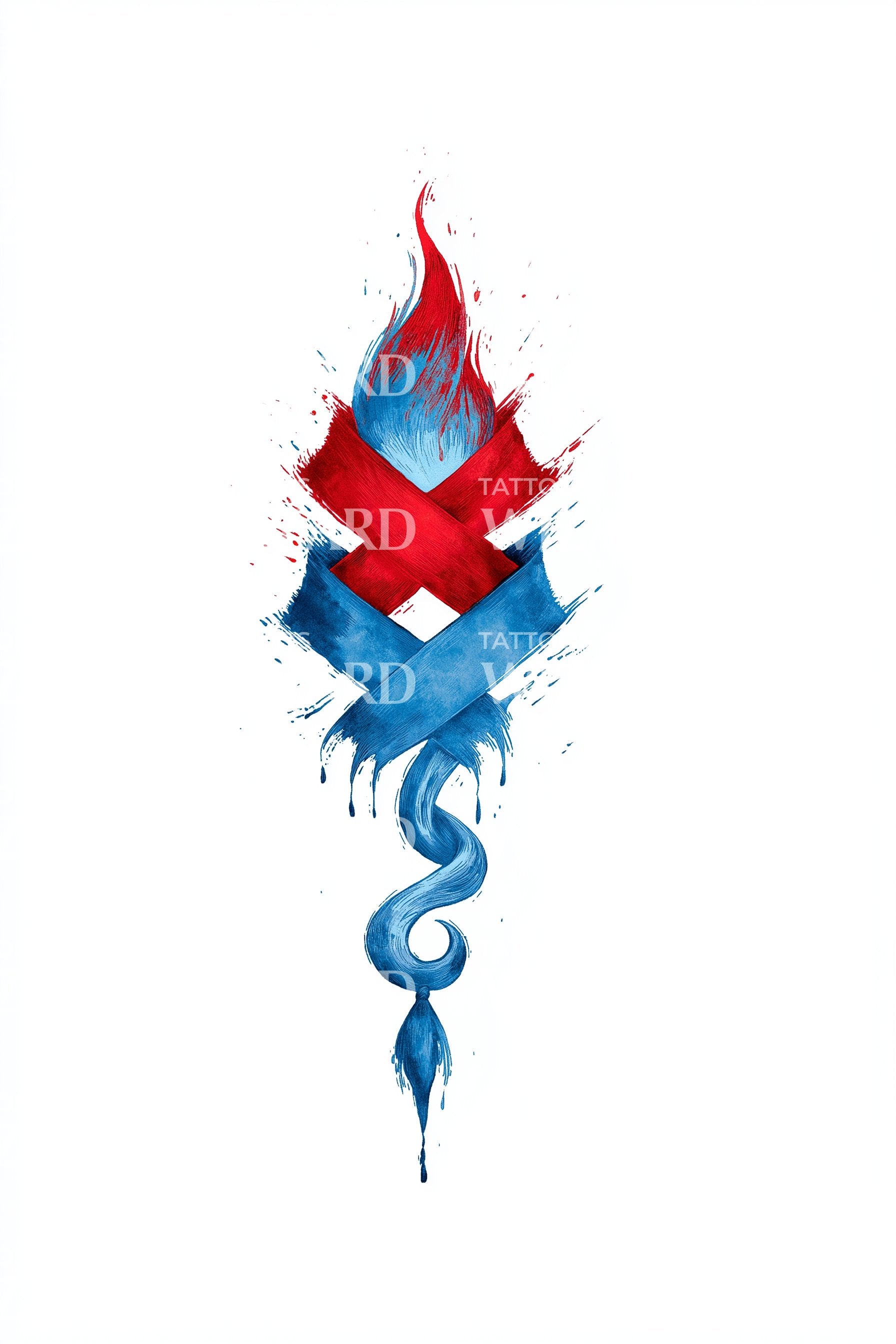 Зажгите свой стиль с этим иллюстративным дизайном татуировки. Воплощая эмблему копья и факела, потрясающее сочетание ярко-красных пламён и холодных синих оттенков обещает создать мощное впечатление. Этот смелый дизайн символизирует силу и стойкость, идеально подходит для тех, кто не боится занять позицию.
